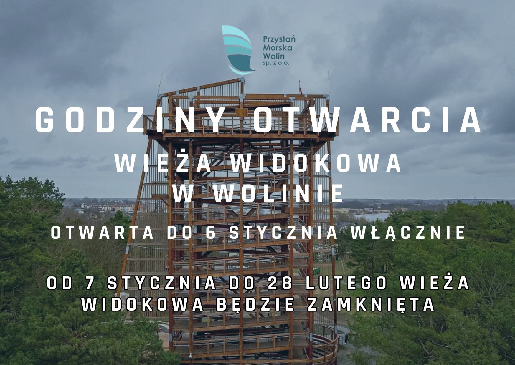 Przystań Morska Wolin sp. z o.o. informuje, że Wieża Widokowa w Wolinie będzie dostępna dla odwiedzających do dnia 6 stycznia (włącznie).