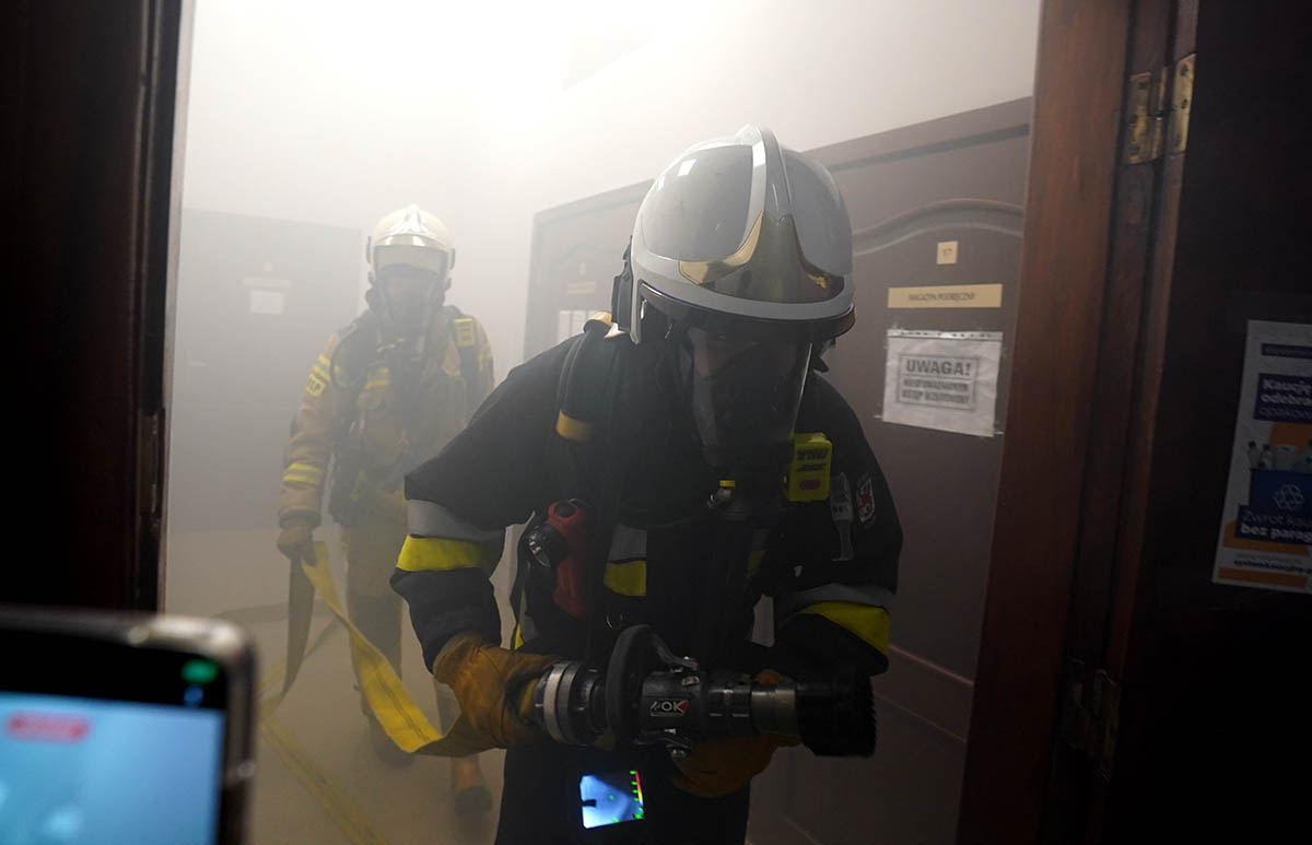 Po dojeździe pierwszych zastępów strażacy przystąpili do rozpoznania sytuacji. Zgodnie ze scenariuszem, w zadymionym obiekcie miała pozostać jedna osoba. Ratownicy zabezpieczeni w sprzęt ochrony układu oddechowego weszli do budynku i rozpoczęli przeszukiwanie pomieszczeń.