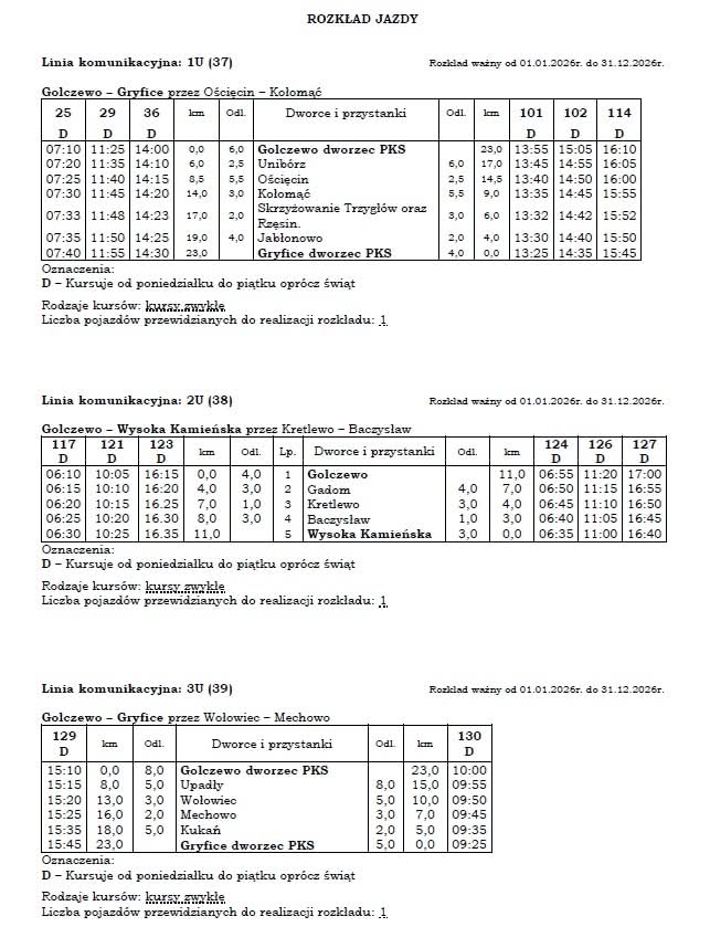 Kursy autobusów będą realizowane wyłącznie w dni robocze, od poniedziałku do piątku, z wyłączeniem świąt. Szczegółowe rozkłady jazdy mają być umieszczone na przystankach autobusowych w miejscowościach objętych obsługą linii