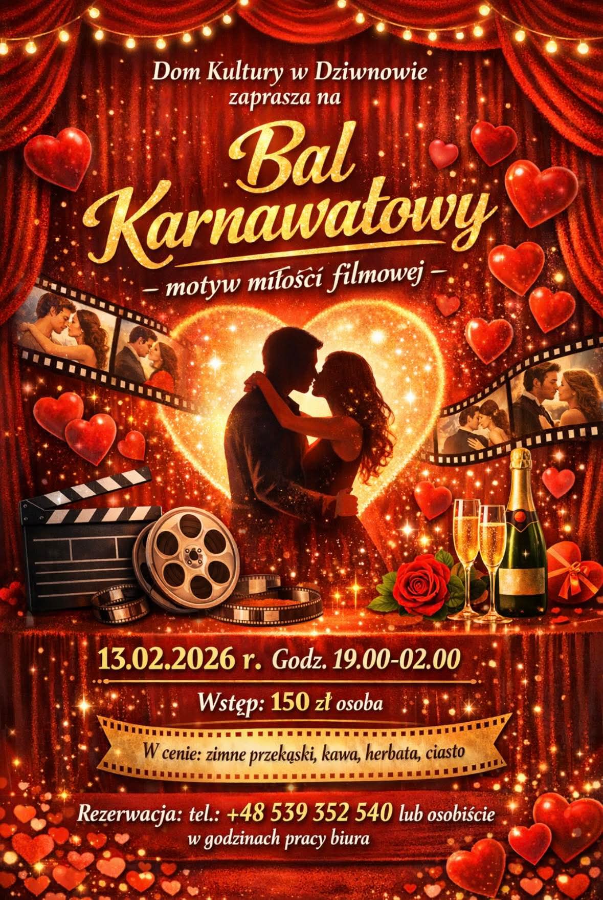 Dom Kultury w Dziwnowie zaprasza na Bal Karnawałowy, który odbędzie się 13 lutego 2026 roku. Tegoroczna edycja wydarzenia organizowana jest pod hasłem „motyw miłości filmowej”, nawiązującym do najbardziej romantycznych scen znanych z kina.
