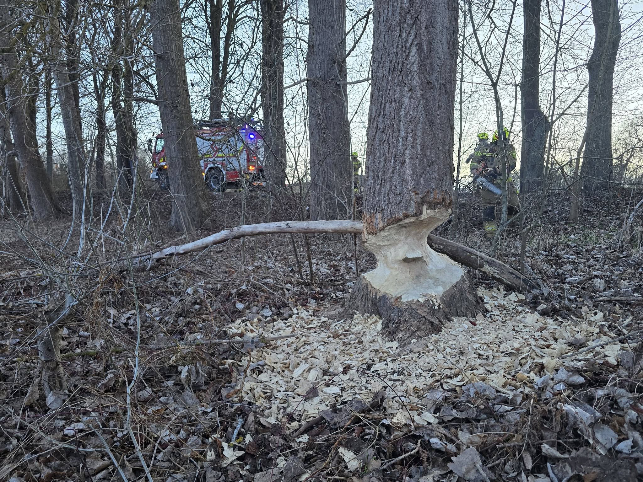 Zgłoszenie dotyczyło drzew rosnących w pobliżu drogi, które zaczęły stwarzać realne ryzyko dla kierowców i pieszych. Po przybyciu na miejsce strażacy szybko ustalili przyczynę – pnie zostały poważnie podcięte przez bobry. Ślady żerowania oraz niemal całkowicie przegryzione drzewa sprawiły, że utraciły one stabilność i mogły przewrócić się w każdej chwili.