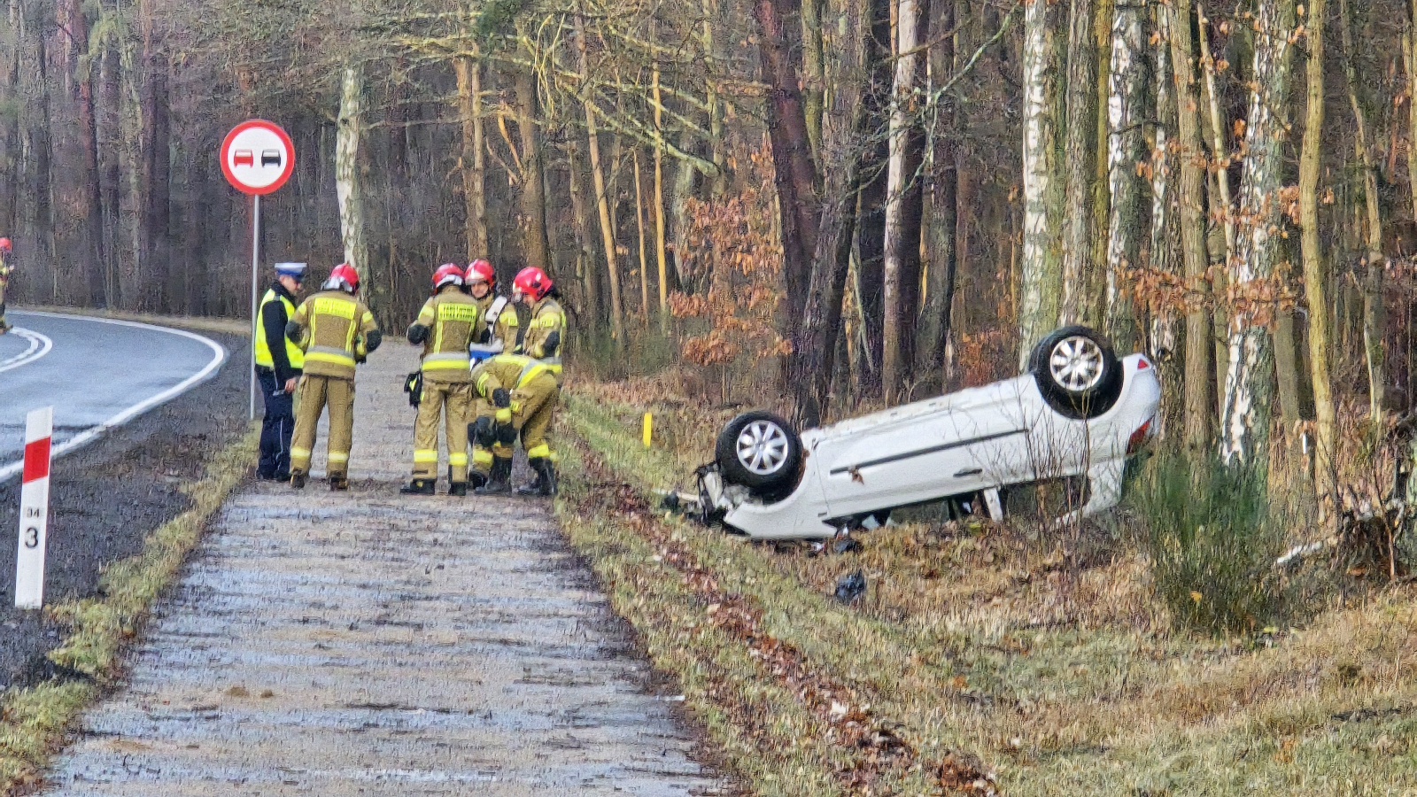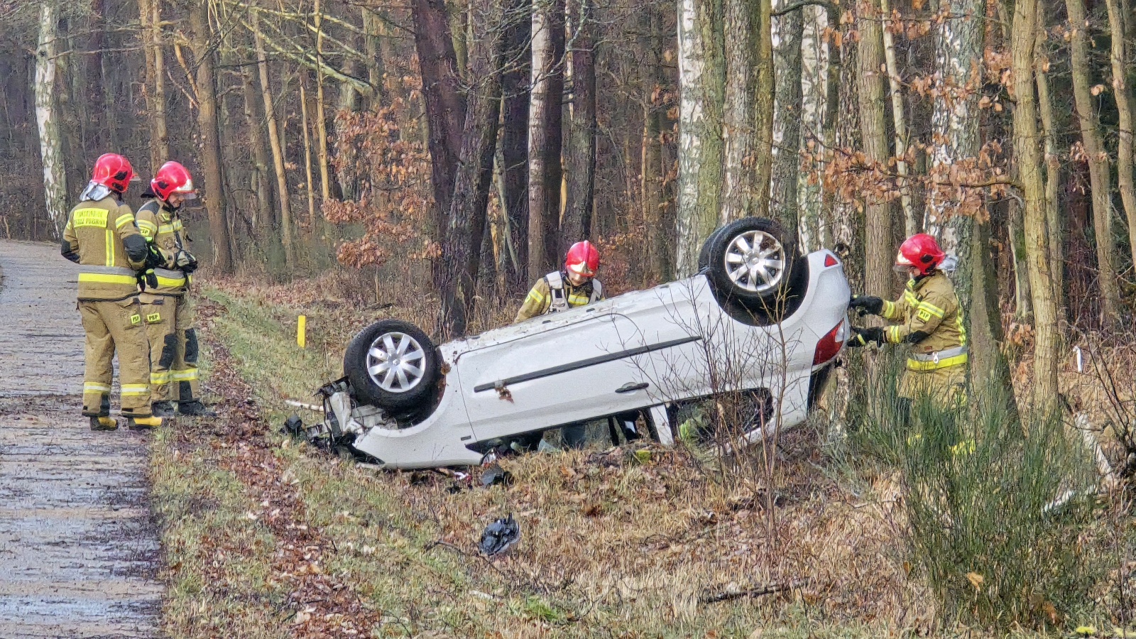 Ze wstępnych informacji wynika, że biały samochód marki Renault dachował na śliskim odcinku drogi. W wyniku wypadku jedna osoba została poszkodowana i trafiła pod opiekę zespołu ratownictwa medycznego.