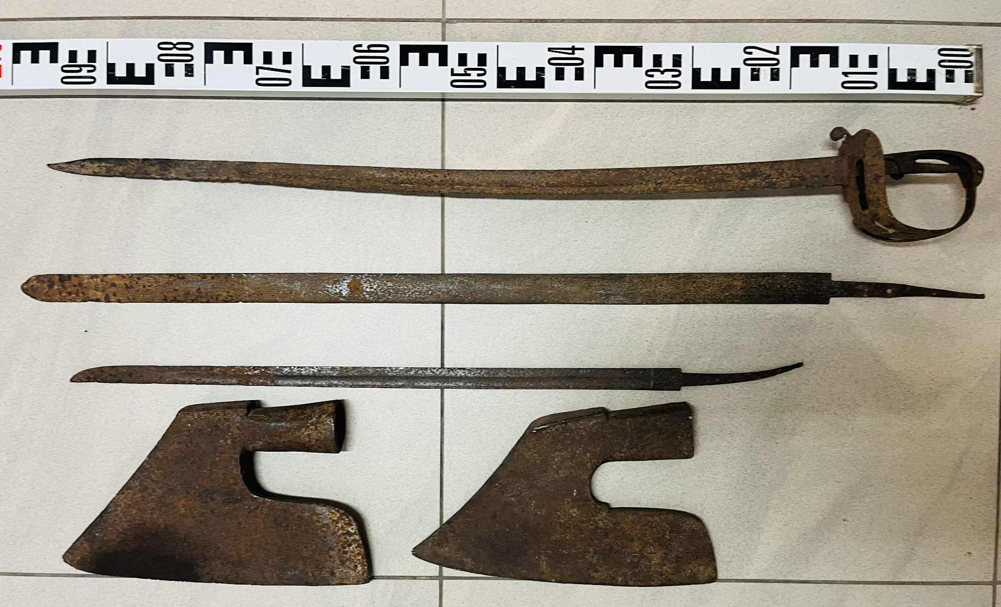 W skład znaleziska wchodzą m.in. dwa żelazne topory, szpada o prostej głowni oraz szpada z zamkniętą rękojeścią typu koszowego. Wszystkie obiekty wykonane są z żelaza i zachowały się w stosunkowo dobrym stanie, mimo widocznych śladów korozji. Na szczególną uwagę zasługują topory, niezwykle masywne i ciężkie – waga jednego z nich dochodzi do 5,5 kilograma!!! Dodatkowo, na powierzchni obu toporów widoczne są dwa różne gmerki – znaki kowalskie lub własnościowe. Te detale, mogą wskazywać, że topory powstały w różnych warsztatach lub zostały wykonane przez różnych rzemieślników.