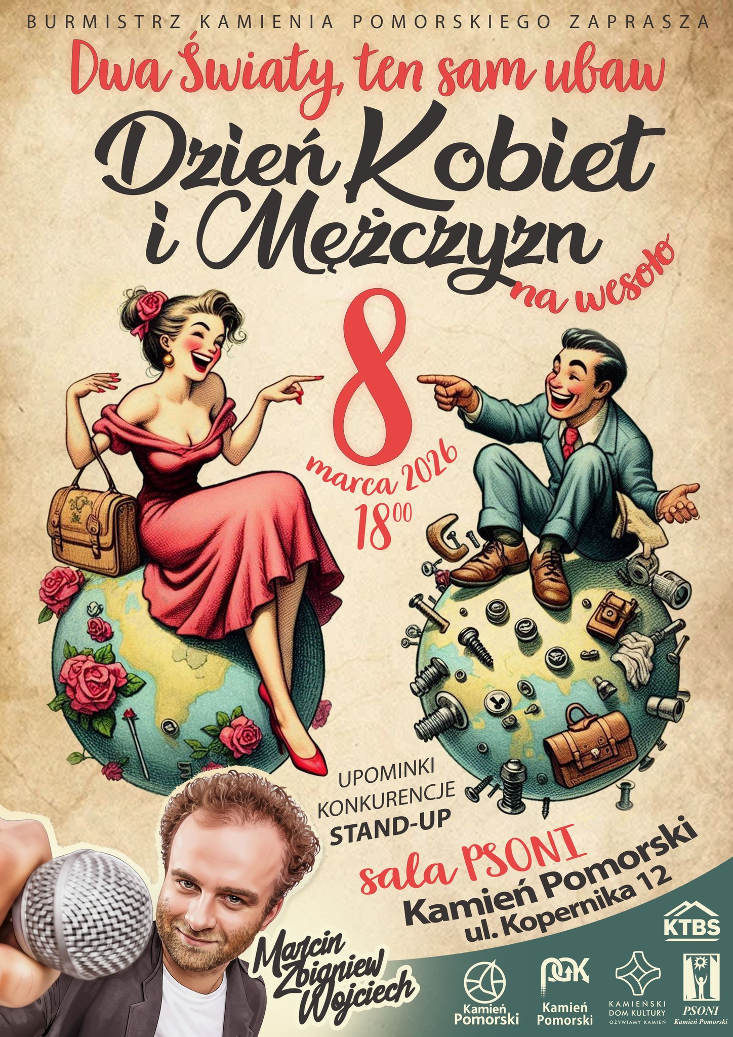 Burmistrz Kamienia Pomorskiego oraz Kamieński Dom Kultury zapraszają mieszkańców na wyjątkowe wydarzenie z okazji Dnia Kobiet i Dnia Mężczyzn. Pod hasłem „Dwa światy, ten sam ubaw” 8 marca 2026 roku o godzinie 18:00 w sali PSONI przy ul. Kopernika 12 odbędzie się wieczór pełen humoru, konkursów i dobrej zabawy.