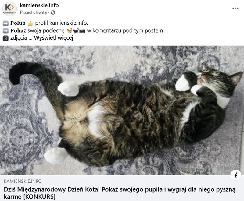 Z tej okazji redakcja kamienskie.info zaprasza czytelników do wspólnej zabawy. Wystarczy w komentarzu pod konkursowym postem na Facebooku opublikować zdjęcie swojego kota. Im więcej reakcji i głosów, tym większa szansa na zdobycie nagrody! Do wygrania jest bezzbożowa karma dla kota, która z pewnością ucieszy każdego futrzastego smakosza.