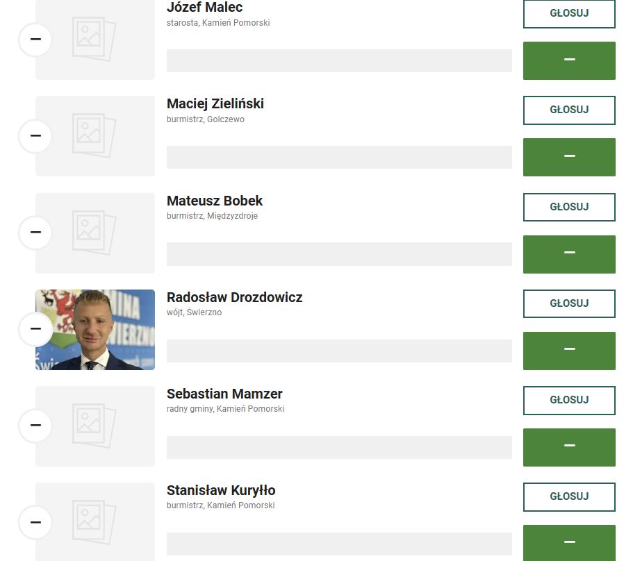 Wśród nominowanych znaleźli się: Starosta Józef Malec, Burmistrz Golczewa Maciej Zieliński, Burmistrz Międzyzdrojów Mateusz Bobek, Wójt Radosław Drozdowicz, radny Sebastian Mamzer oraz Burmistrz Stanisław Kuryłło.