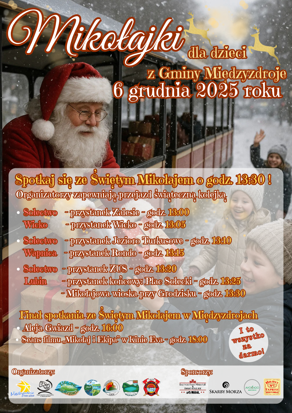 W sobotę 6 grudnia Międzyzdroje zapraszają na Mikołajki 2025. Animacje i spotkania w sołectwach rozpoczną się o godz. 13:30, a o godzinie 16:00 zaplanowano finał wydarzenia na Alei Gwiazd. Zwieńczeniem dnia będzie film dla całych rodzin – „Mikołaj i ekipa” o godz. 18:00 w kinie Eva.