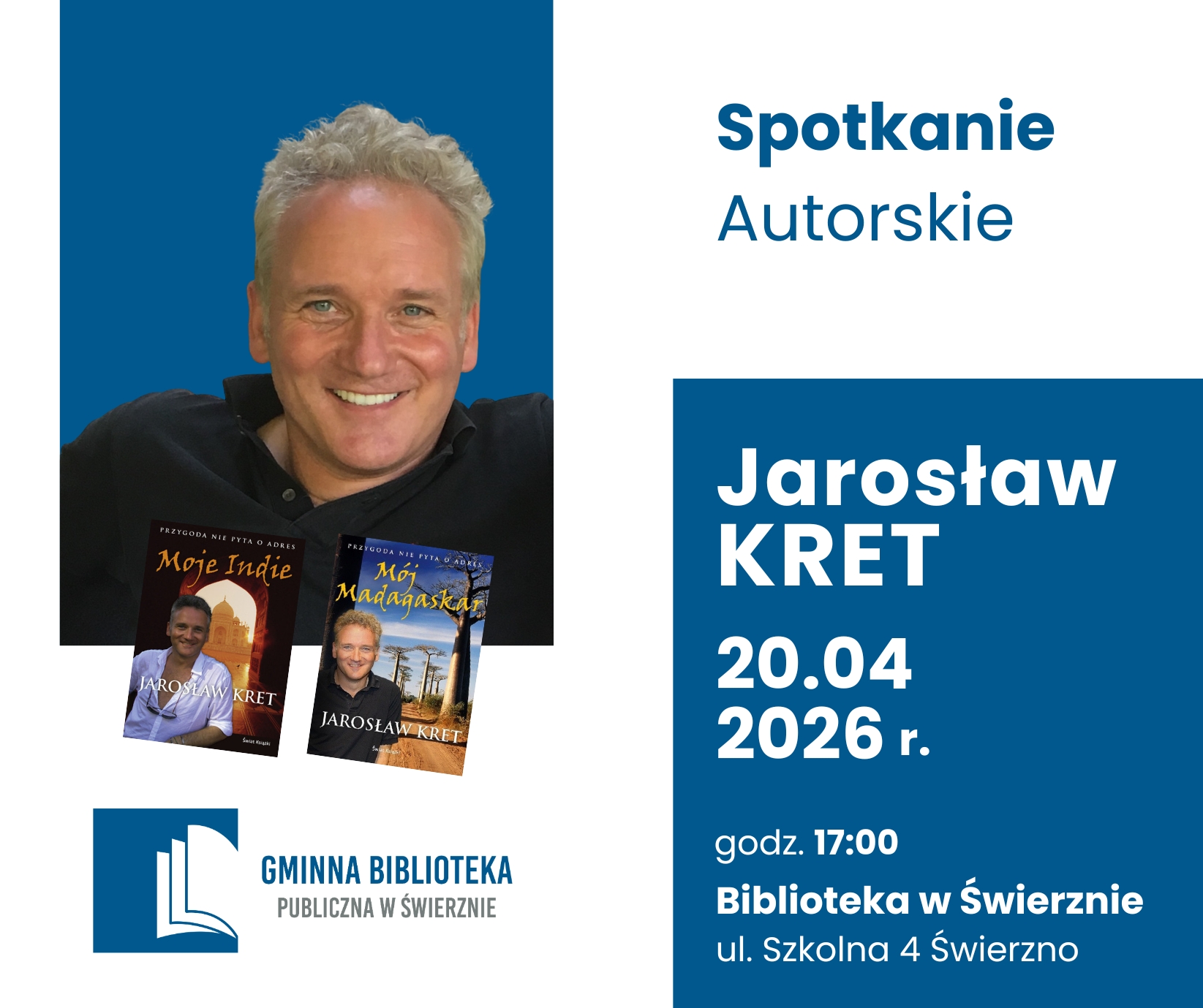 Już 20 kwietnia 2026 r. o godz. 17:00 zapraszamy do Biblioteki w Świerznie (ul. Szkolna 4) na wyjątkowe spotkanie z niezwykłym gościem! Naszym gościem będzie Jarosław Kret – dziennikarz telewizyjny, prezenter pogody, fotoreporter i podróżnik, autor licznych książek, reportaży orazfilmów dokumentalnych o tematyce podróżniczej.