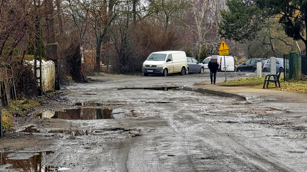 Na drodze prowadzącej w kierunku Wyspy Chrząszczewskiej pojawiły się ogromne dziury, głębokie koleiny i rozlewiska wody, które po opadach zamieniają trasę w błotnistą przeprawę. Samochody poruszają się bardzo wolno, omijając wyrwy w jezdni, a piesi często zmuszeni są iść obłoconym poboczem.
