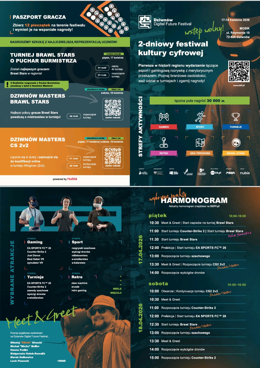 To pierwsze w historii regionu wydarzenie łączące esport i gamingową rozrywkę z merytorycznym przekazem. Dziwnów Digital Future Festival (DDFF) odbędzie się 17 i 18 kwietnia, oferując szereg atrakcji dla mieszkańców w różnym wieku. To m.in. turnieje z nagrodami, prelekcje o cyberbezpieczeństwie, wyścigi dronów i spotkania z influencerami. Wstęp na wydarzenie jest darmowy.