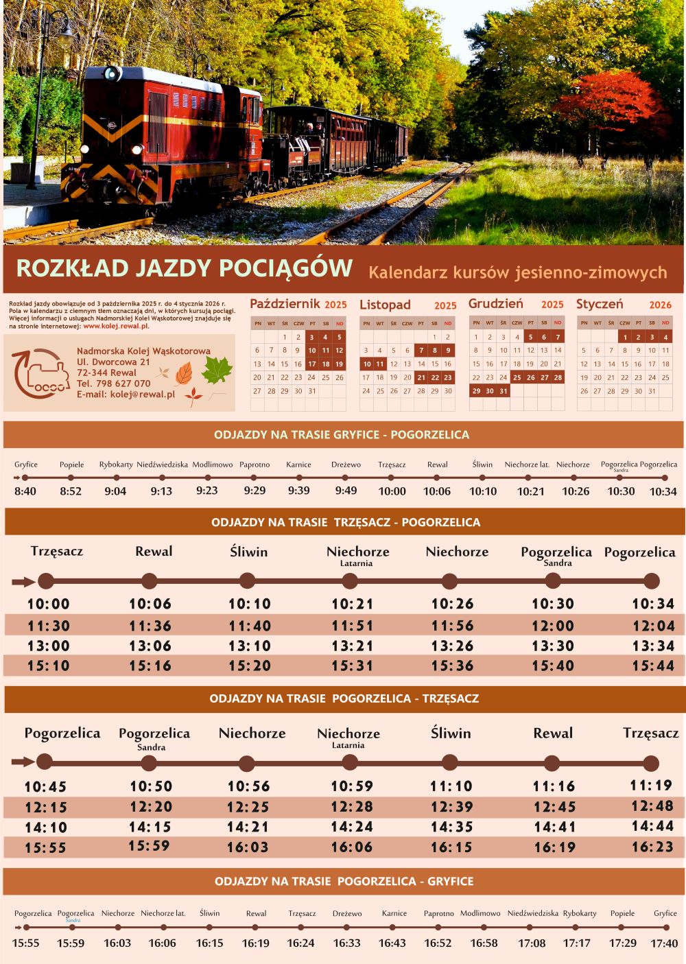 Z nadejściem jesieni zmienia się również rozkład jazdy pociągów Nadmorskiej Kolei Wąskotorowej. Od października pasażerowie będą mogli skorzystać z czterech pełnych kursów na nadmorskiej trasie pomiędzy Trzęsaczem i Pogorzelicą. Pierwszy kurs z Gryfic do Pogorzelicy nie ulega zmianie (odjazd o godz. 8:40), natomiast zmieni się ostatni kurs z Trzęsacza do Pogorzelicy, który przesunięty zostaje z godz. 17:00 na godz. 15:10. Według nowego rozkładu jazdy ostatni pociąg z Pogorzelicy odjedzie o godz. 15:55 i zakończy bieg w Gryficach o godz. 17:40.