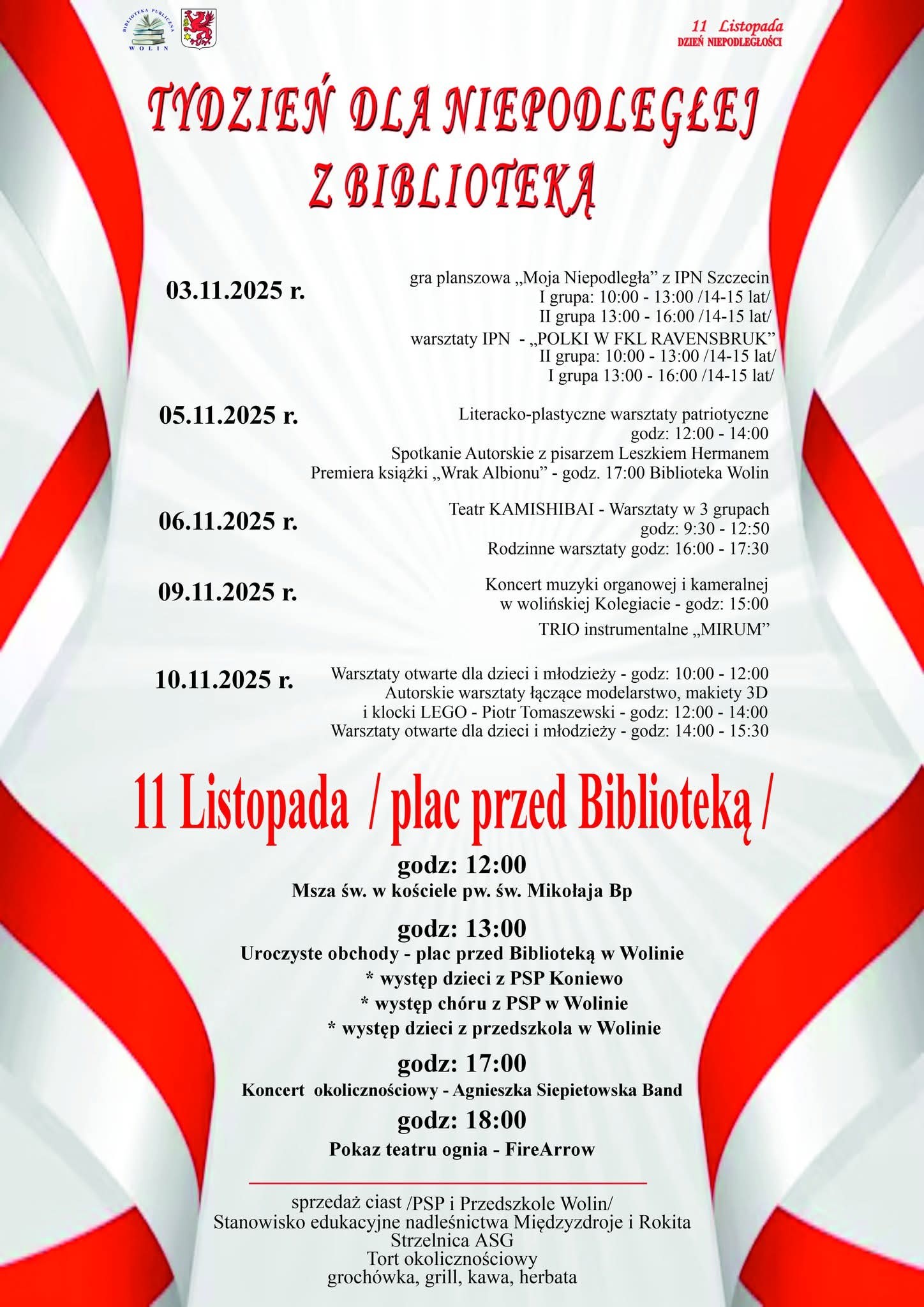 Wolin przygotował bogaty program wydarzeń, które przez cały tydzień poprzedzający 11 listopada będą przypominały o drodze Polaków do wolności. Pod hasłem „Tydzień dla Niepodległej z Biblioteką”, mieszkańcy gminy mogą wziąć udział w warsztatach, koncertach, spotkaniach autorskich i uroczystościach patriotycznych, które zwieńczą obchody Narodowego Święta Niepodległości.
