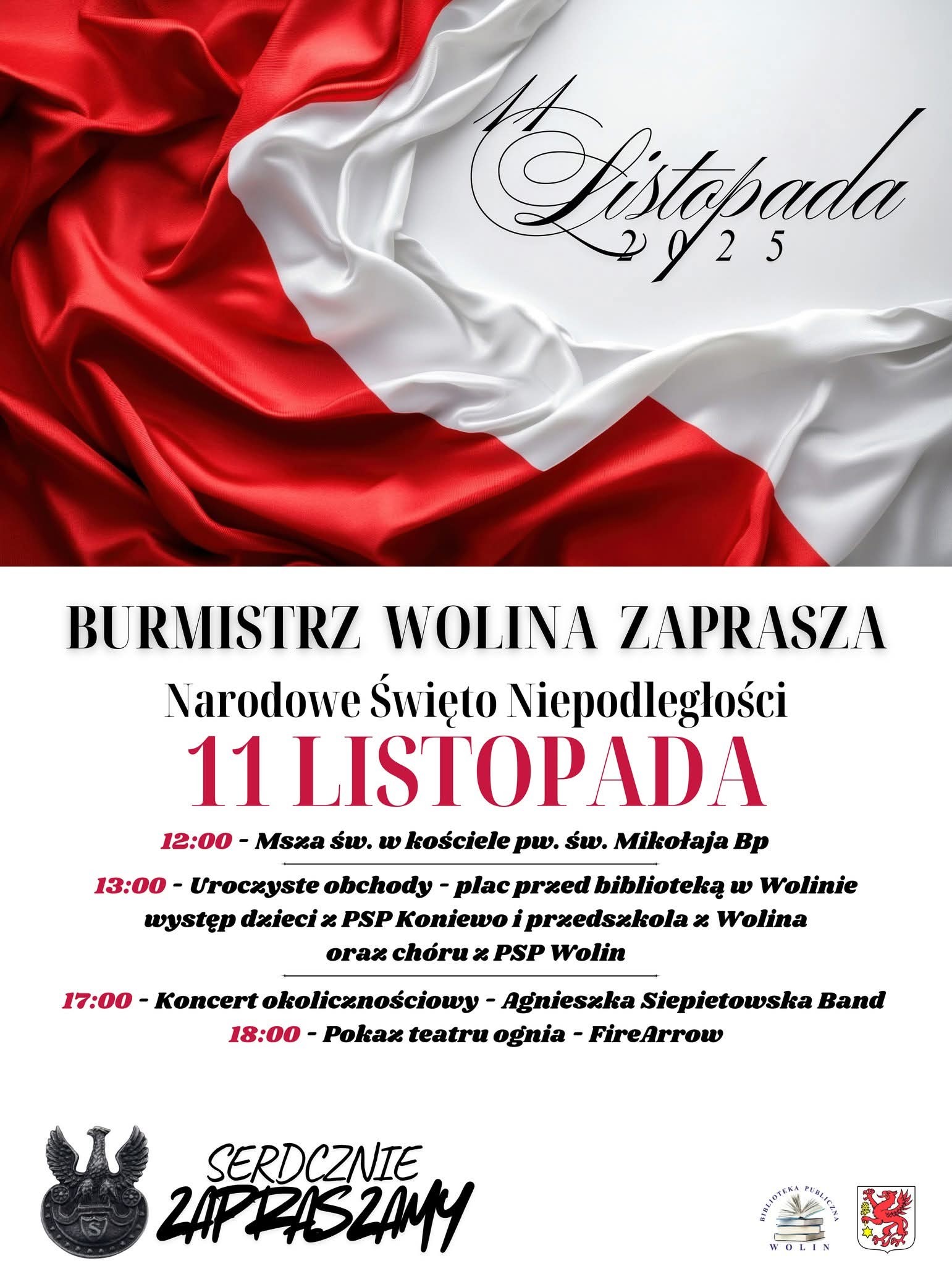 Najważniejsze wydarzenia rozpoczną się o godz. 12:00 uroczystą Mszą świętą w kościele pw. św. Mikołaja Biskupa. O godz. 13:00 na placu przed Biblioteką odbędą się główne obchody Narodowego Święta Niepodległości, podczas których wystąpią: dzieci z ZSP w Koniewie, chór z PSP w Wolinie, dzieci z wolińskiego przedszkola.