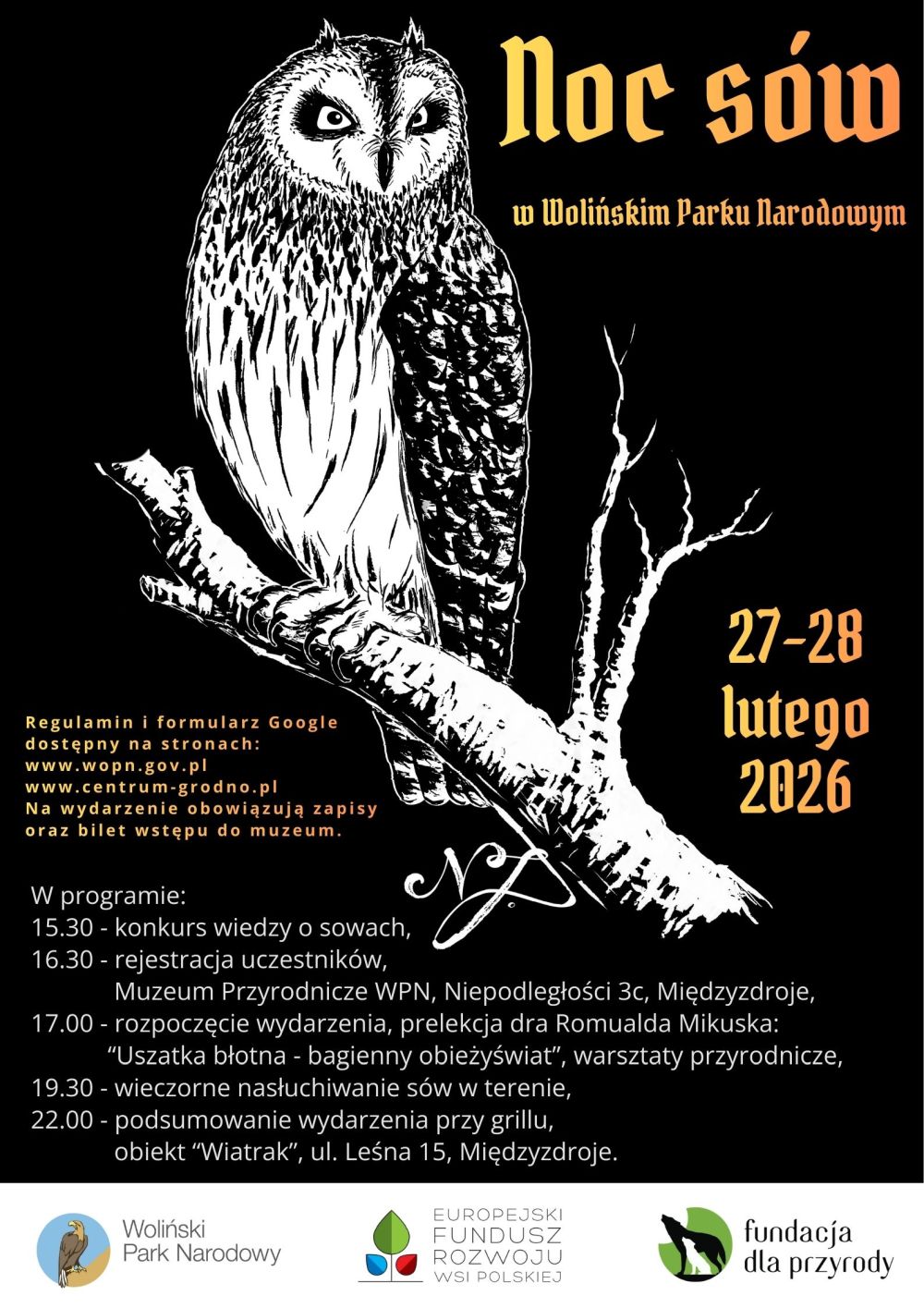 Woliński Park Narodowy zaprasza miłośników przyrody na wyjątkowe wydarzenie edukacyjno-przyrodnicze – Noc Sów 2026, które pozwoli uczestnikom odkryć tajemnice nocnego życia lasu oraz poznać fascynujący świat sów występujących na terenie Parku.