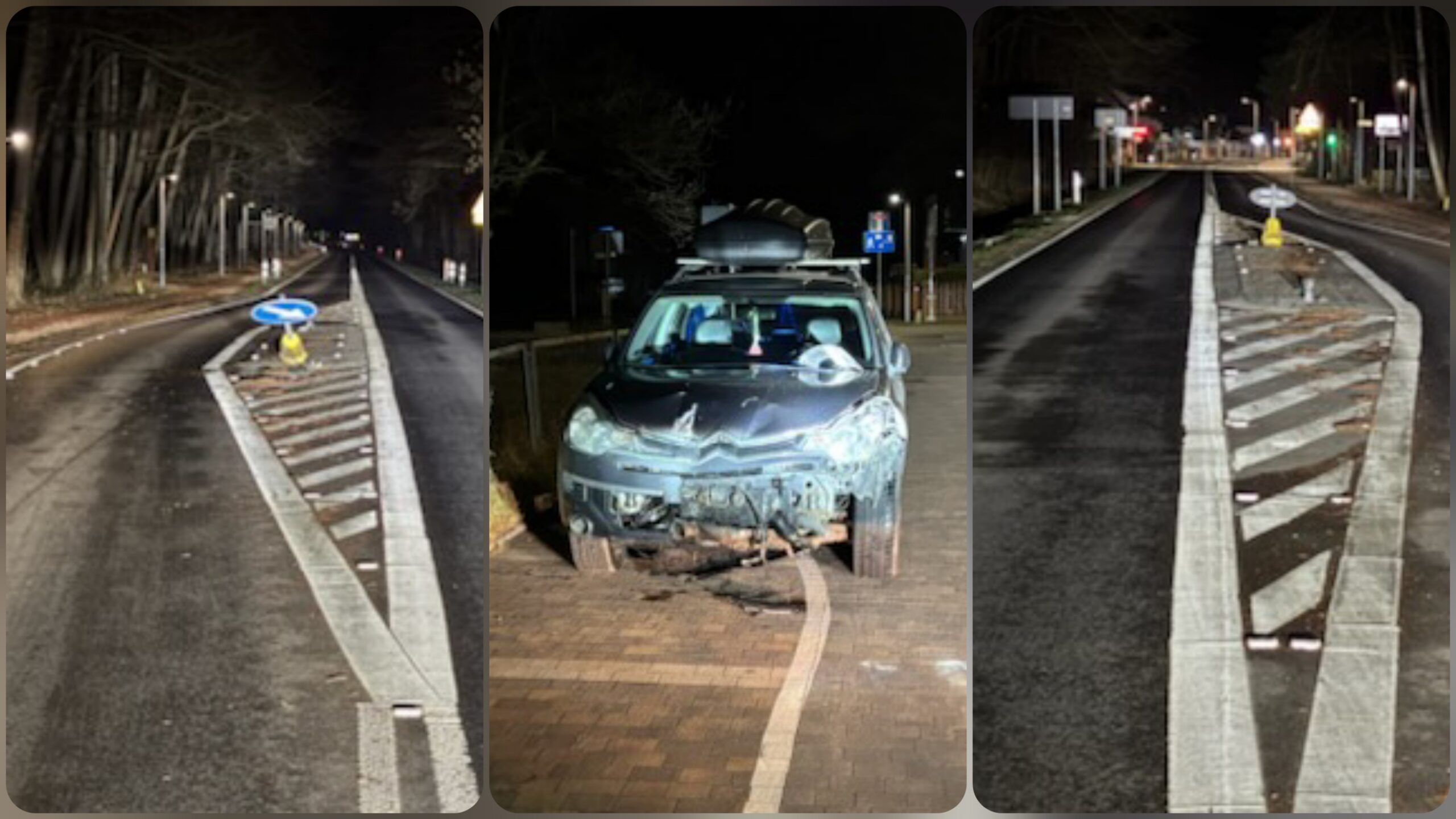 Siła uderzenia była na tyle duża, że pojazd przejechał przez elementy infrastruktury drogowej, uszkadzając oznakowanie, a następnie zatrzymał się dopiero kilkadziesiąt metrów dalej.