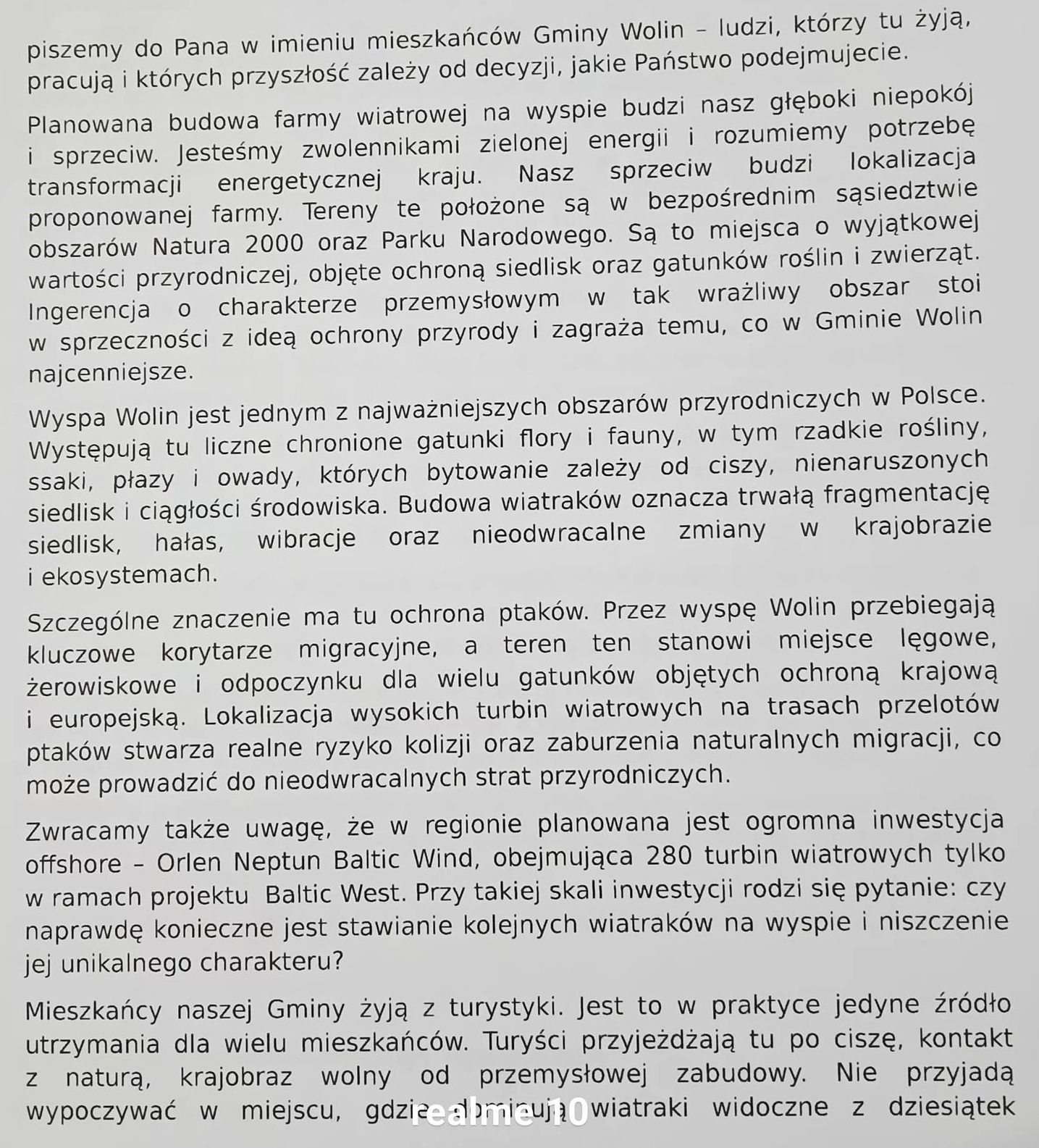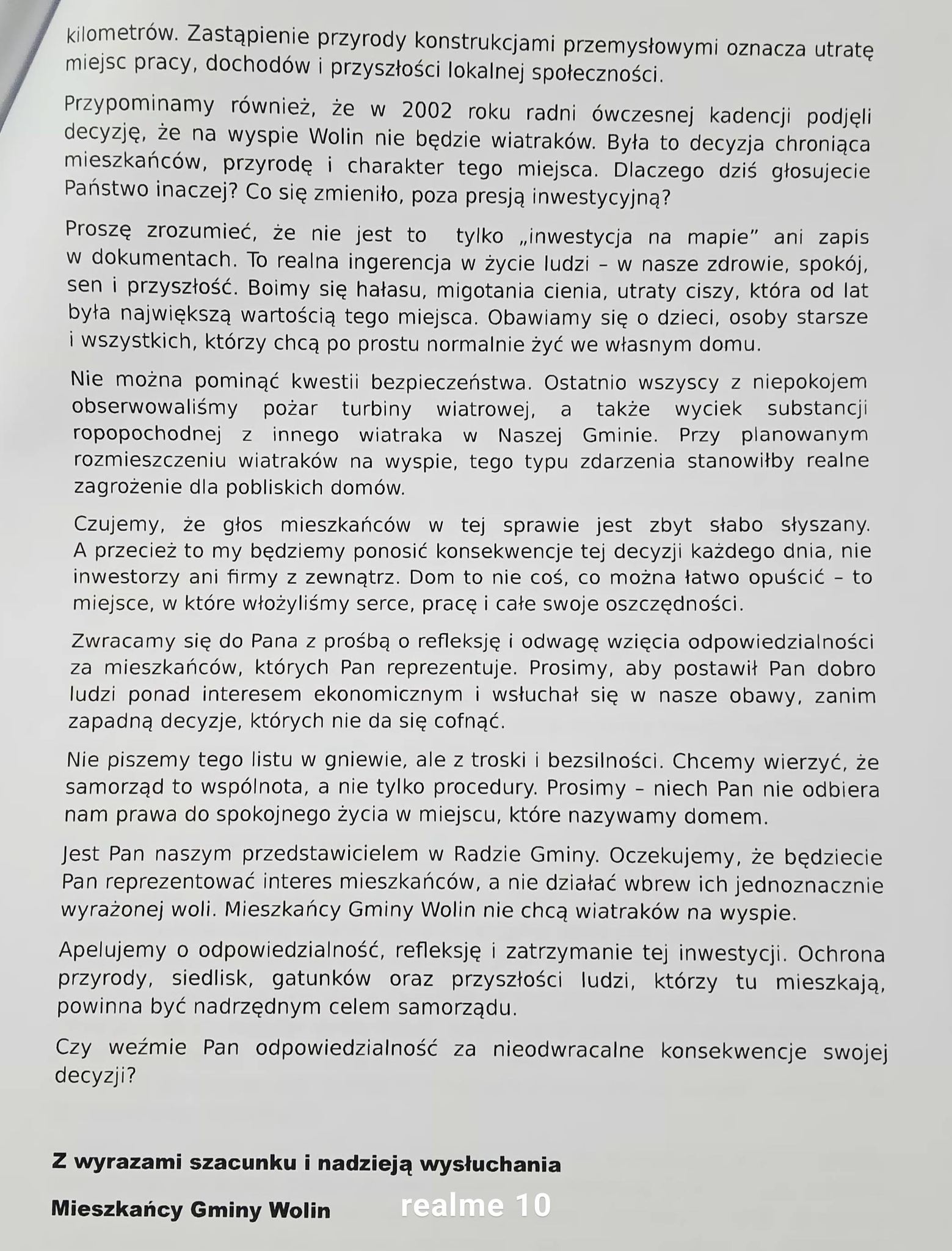 W związku ze zbliżającym się posiedzeniem mieszkańcy postanowili podjąć dodatkowe działania. Do każdego radnego Rady Miejskiej w Wolinie skierowany został imienny list, w którym autorzy apelują o refleksję i wzięcie odpowiedzialności za decyzje, jakie mogą zapaść w sprawie inwestycji. W piśmie mieszkańcy podkreślają, że nie sprzeciwiają się samej idei zielonej energii, lecz lokalizacji farmy wiatrowej w bezpośrednim sąsiedztwie obszarów chronionych, w tym terenów Natura 2000 oraz Wolińskiego Parku Narodowego.