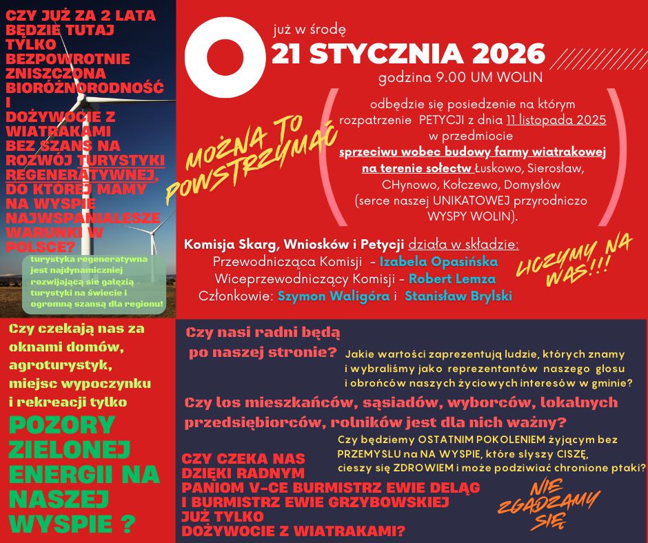 W środę 21 stycznia 2026 roku w Urzędzie Miejskim w Wolinie odbędzie się posiedzenie, podczas którego radni pochylą się nad petycją mieszkańców sprzeciwiających się planowanej budowie farmy wiatrowej na terenie wyspy Wolin. Sprawa od miesięcy budzi silne emocje i sprzeciw części lokalnej społeczności, która obawia się konsekwencji inwestycji dla środowiska, turystyki oraz jakości życia.