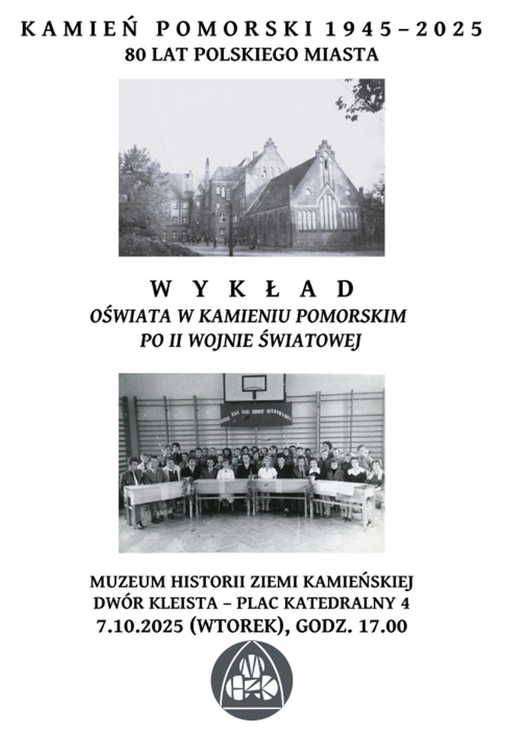 7 października 2025 roku (wtorek) o godzinie 17:00 w Muzeum Historii Ziemi Kamieńskiej odbędzie się kolejny wykład z cyklu poświęconego najnowszej historii miasta. Spotkania te organizowane są w ramach obchodów 80-lecia polskiego Kamienia Pomorskiego i odbywają się co miesiąc aż do maja 2026 roku. Tym razem tematem będzie „Oświata w Kamieniu Pomorskim po II wojnie światowej”. Wykład zaplanowano w historycznym Dworze Kleista przy placu Katedralnym 4.