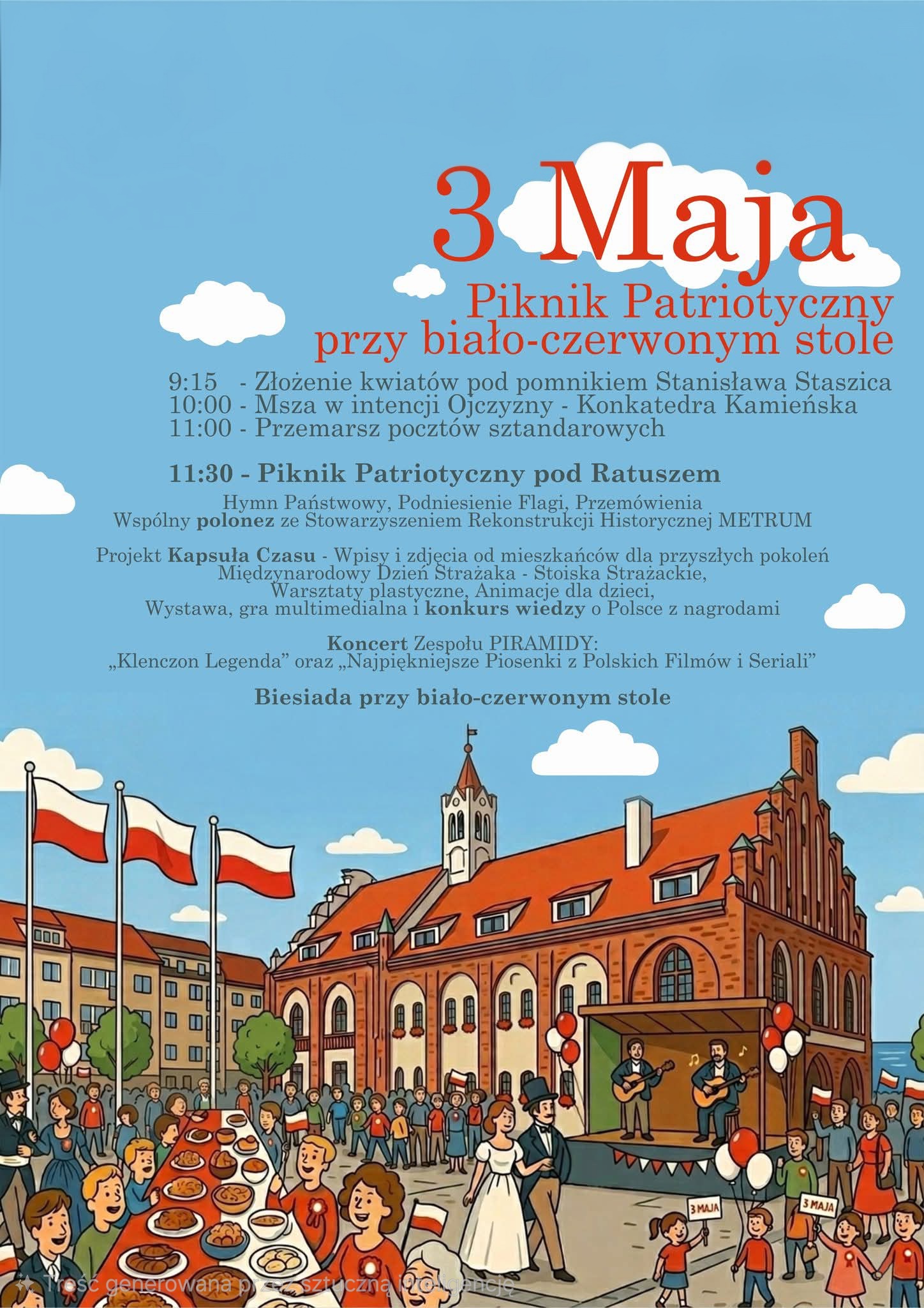 Gmina Kamień Pomorski oraz Kamieński Dom Kultury zaprasza mieszkańców na obchody Święta Konstytucji 3 Maja. W niedzielę, 3 maja, w centrum miasta odbędzie się Piknik Patriotyczny przy biało-czerwonym stole. W programie znalazły się uroczystości oficjalne, przemarsz, wspólne śpiewanie hymnu, atrakcje dla dzieci, koncert oraz symboliczna kapsuła czasu.