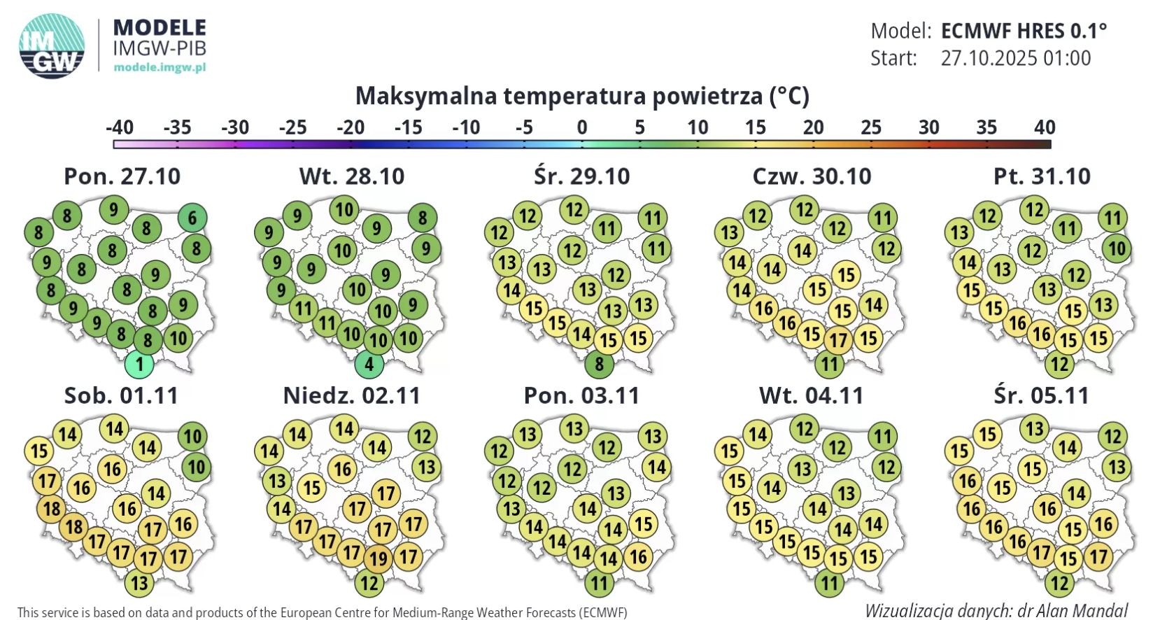 Meteorolodzy prognozują, że ciepła aura utrzyma się przez kilka kolejnych dni. Od poniedziałku do środy (3-5 listopada) maksymalne temperatury sięgną 13-17 stopni. Najcieplej będzie na południu i wschodzie kraju, nieco chłodniej na północnym wschodzie.