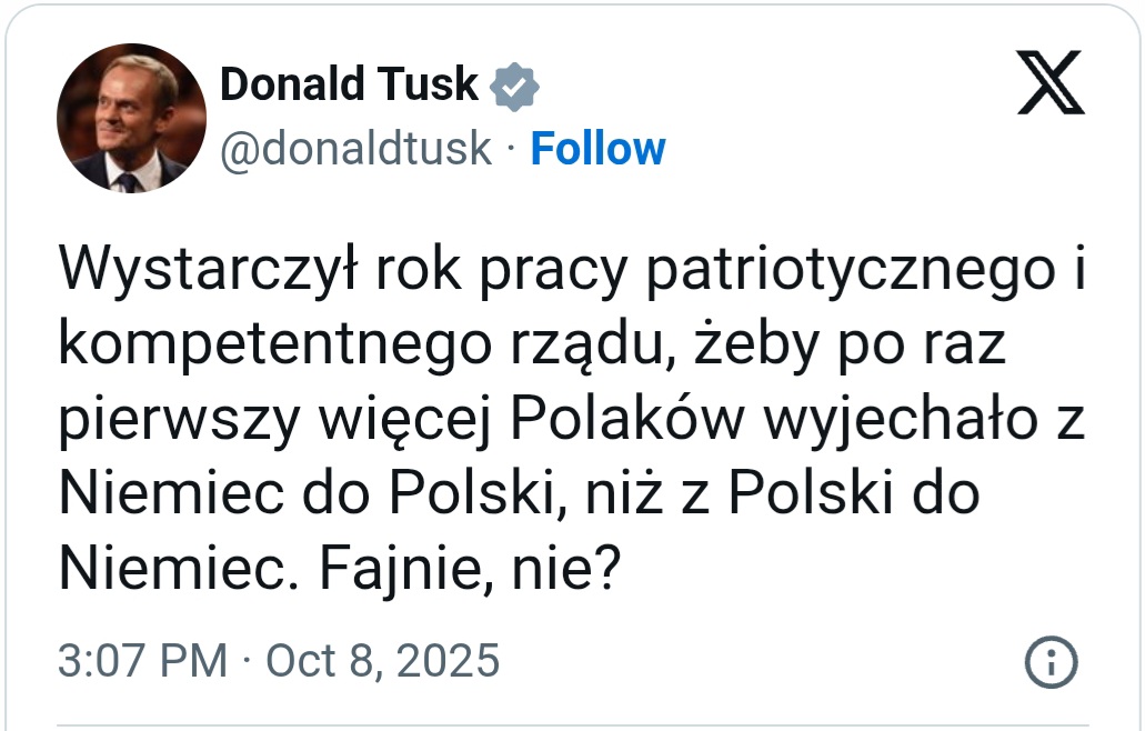 „Wystarczył rok pracy patriotycznego i kompetentnego rządu, żeby po raz pierwszy więcej Polaków wyjechało z Niemiec do Polski, niż z Polski do Niemiec. Fajnie, nie?” – napisał premier.