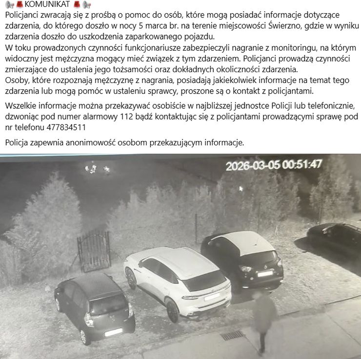 Do zdarzenia doszło w nocy z 4 na 5 marca na terenie Świerzna. W wyniku incydentu doszło do uszkodzenia zaparkowanego pojazdu należącego do wójta Funkcjonariusze w toku prowadzonych czynności zabezpieczyli zapis z monitoringu, na którym widoczny jest mężczyzna mogący mieć związek ze zdarzeniem. Policjanci prowadzą obecnie działania zmierzające do ustalenia jego tożsamości oraz dokładnych okoliczności całego zajścia.