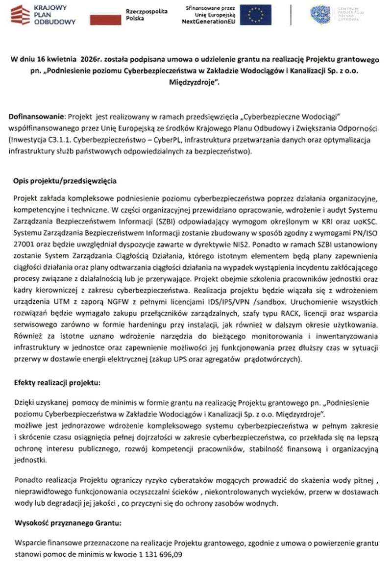 W dniu 16 kwietnia 2026 roku podpisano umowę na realizację projektu pod nazwą „Podniesienie poziomu Cyberbezpieczeństwa w Zakładzie Wodociągów i Kanalizacji Sp. z o.o. Międzyzdroje”. Przedsięwzięcie zostało dofinansowane w ramach Krajowego Planu Odbudowy i Zwiększania Odporności, w programie „Cyberbezpieczne Wodociągi”.