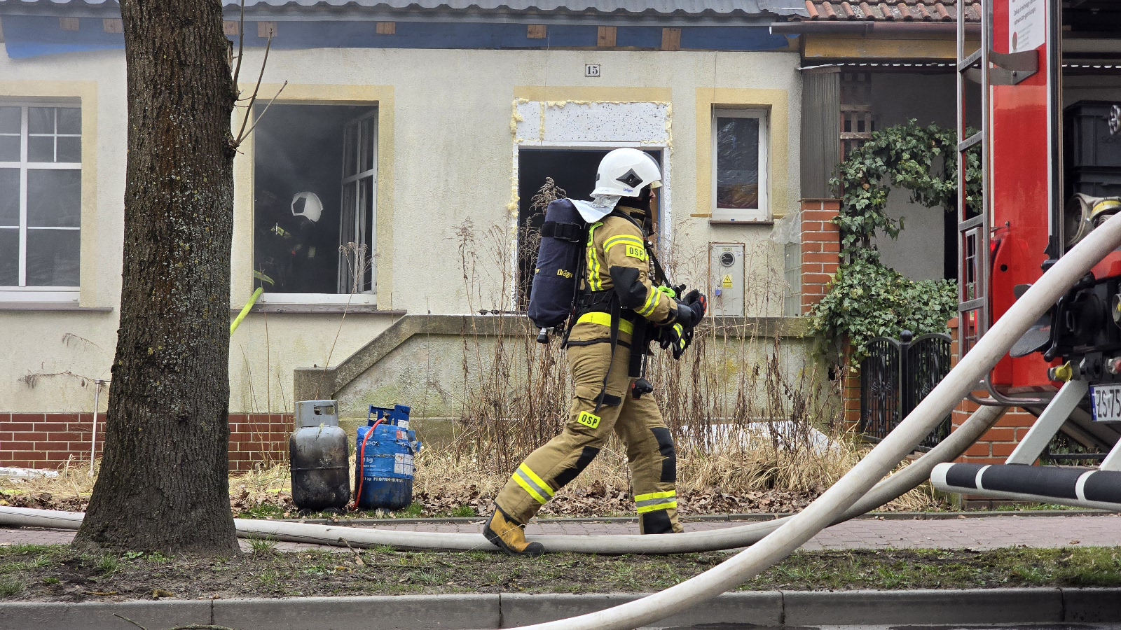 Na miejscu cały czas trwają działania gaśnicze. Strażacy wynieśli z budynku butle z gazem oraz inne łatwopalne elementy.