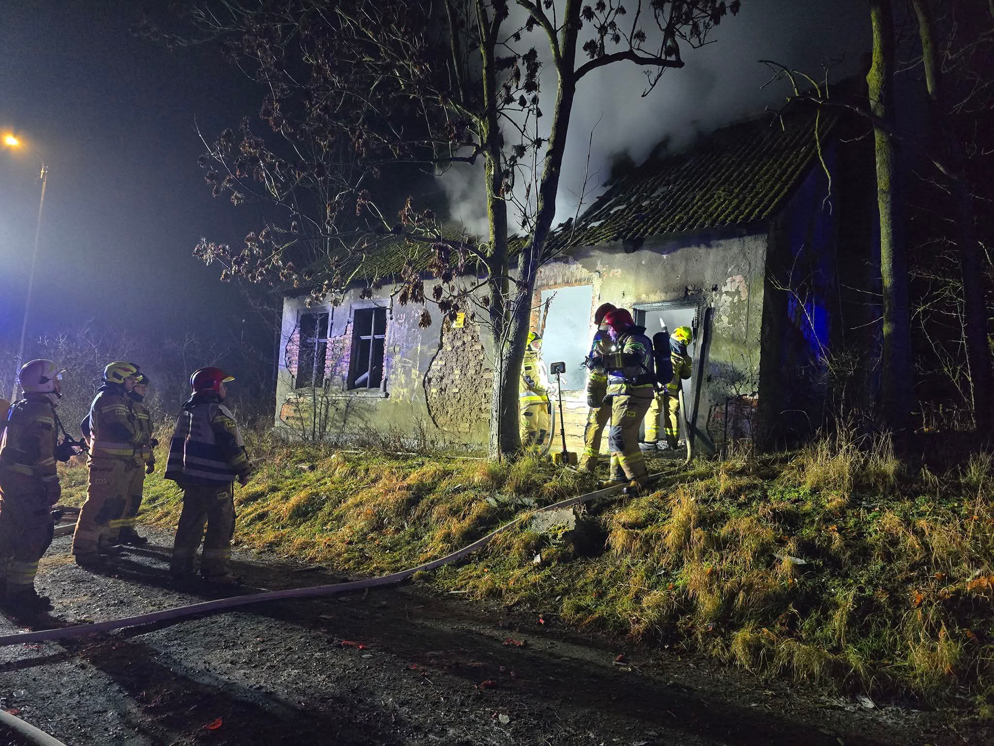 Po przybyciu na miejsce strażacy zastali rozwinięty pożar w opuszczonym budynku. Ogień obejmował część konstrukcji obiektu, a z wnętrza wydobywał się gęsty dym. Działania ratowniczo-gaśnicze polegały na zabezpieczeniu terenu, podaniu prądów wody oraz dokładnym przeszukaniu i dogaszeniu zarzewi ognia, aby zapobiec ponownemu rozprzestrzenieniu się pożaru.