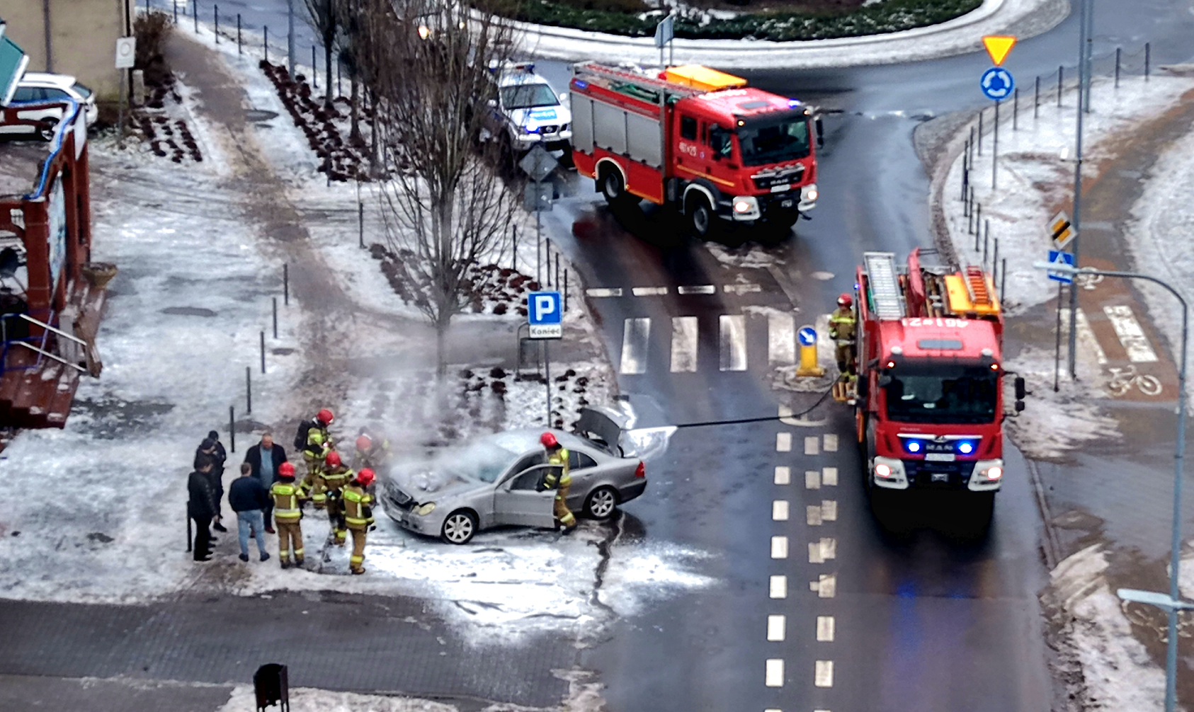 Na miejsce skierowano dwa zastępy straży pożarnej z Kamienia Pomorskiego oraz patrol policji. Strażacy po przybyciu na miejsce przystąpili do działań gaśniczych, wykorzystując pianę gaśniczą. W trakcie akcji otwarto maskę pojazdu i dokładnie sprawdzono komorę silnika, w której doszło do spalenia lub nadpalenia elementów.