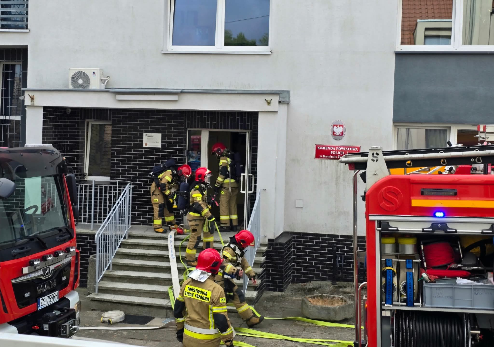 Dzisiaj o godz.10 doszło do pożaru w budynku Komendy Powiatowej Policji w Kamieniu Pomorskim. Pożar objął jedno pomieszczenie. Z budynku ewakuowano policjantów, pracowników cywilnych oraz interesantów. Na miejsce natychmiast przyjechała straż pożarna.