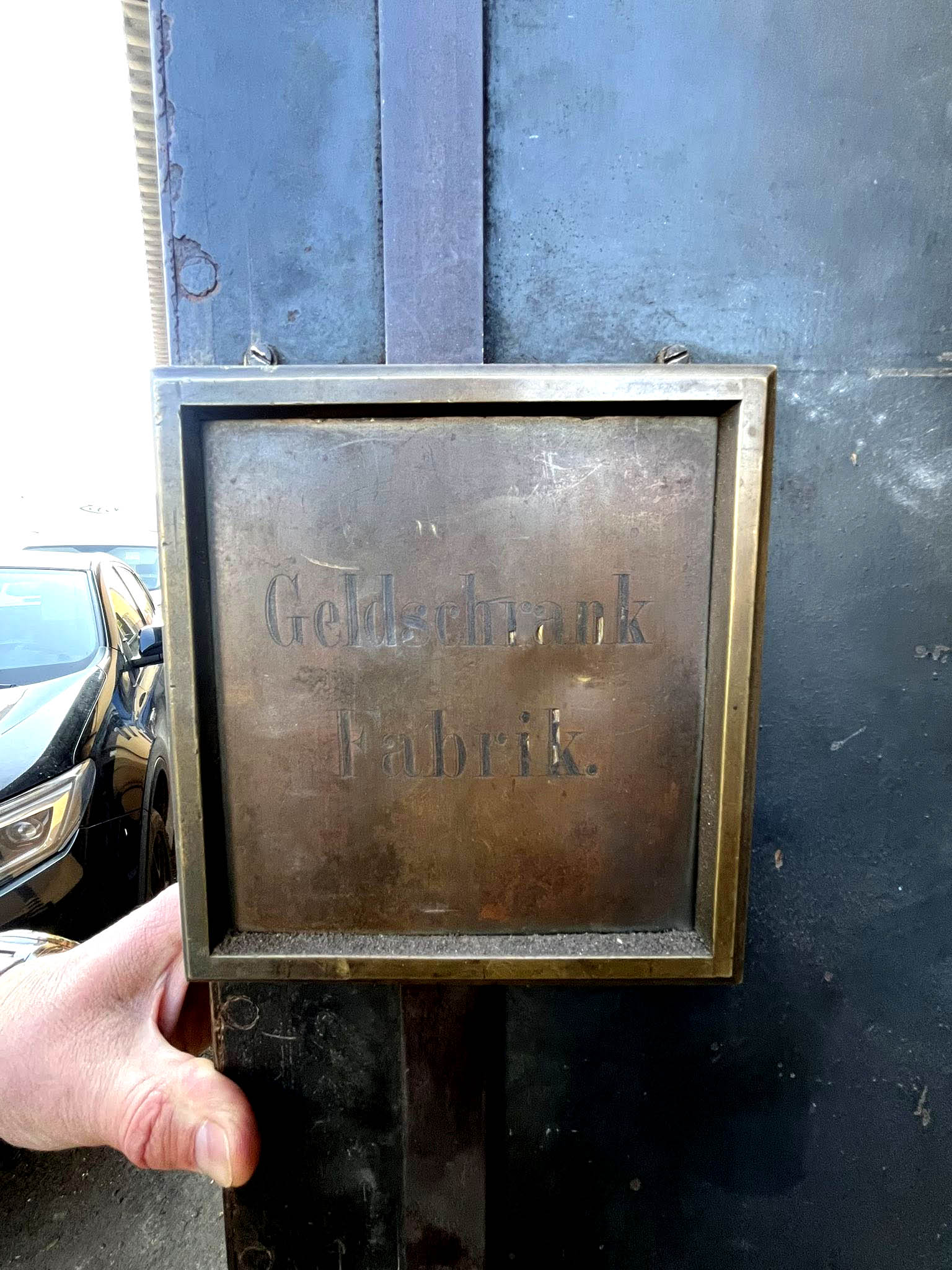Na tle stonowanej, jasnobrązowej powierzchni wyraźnie wyróżniają się złocone elementy metalowe – finezyjne szyldy, ozdobne rozety oraz masywne uchwyty zamków o starannie opracowanej formie. Centralnie rozmieszczone okucia tworzą harmonijną kompozycję dekoracyjną, podkreślając prestiżowy charakter obiektu. Widoczne są również okrągłe otwory zamkowe, świadczące o rozbudowanym systemie zabezpieczeń. Całość łączy w sobie funkcjonalność z estetyką typową dla wysokiej klasy wyrobów rzemiosła metalowego początku XX wieku.