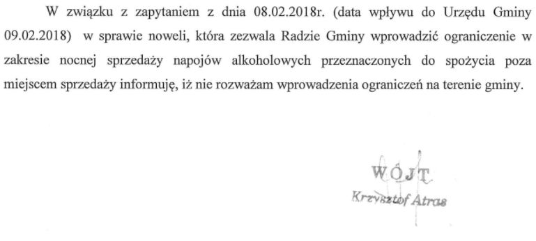 Ciekawe, w jakim sklepie w gminie Świerzno , ktokolwiek kupi alkohol ? Nic dziwnego, ze wójt nie podpisuje takiej ustawy, bo żaden sklep nie jest w nocy otwarty.
