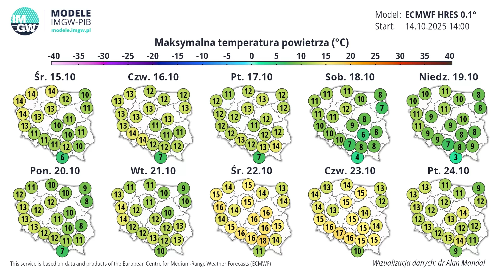 Jeśli prognozy się potwierdzą, w czwartek 23 października w centralnej i południowo-zachodniej Polsce termometry mogą pokazać nawet 17-18 stopni, a lokalnie – na Mazowszu – około 20 stopni Celsjusza. Również numeryczne prognozy IMGW wskazują na ocieplenie w połowie przyszłego tygodnia. Instytut przewiduje, że w środę 22 października temperatura wzrośnie.