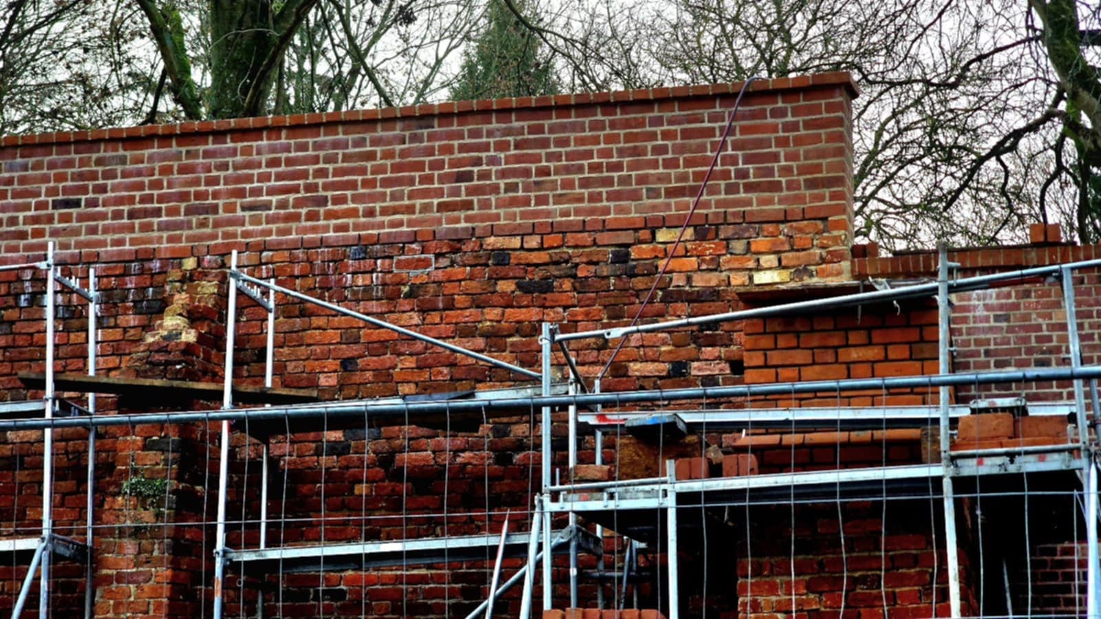 Zakres prac obejmuje m.in. wzmocnienie konstrukcji murów, uzupełnienie ubytków cegły, naprawę przypór, stabilizację fundamentów oraz właściwe spoinowanie. Widoczne są również wyeksponowane kamienne partie fundamentowe, które podkreślają autentyczność i historyczny charakter obiektu.