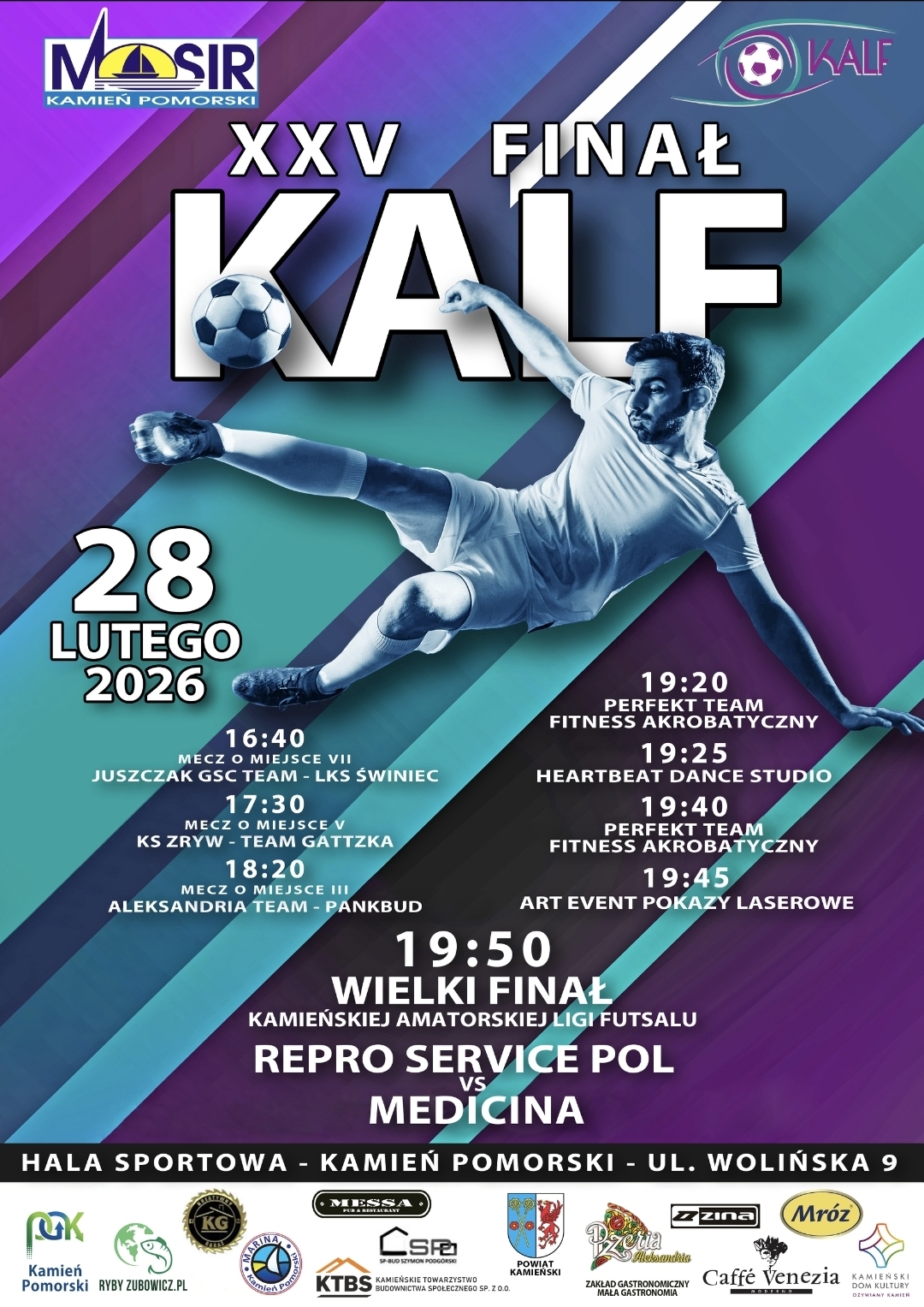 O 19:45 tuż przed prezentacją finalistów o odpowiedni nastrój wydarzenia zadba ArtEvent Laser Shows w efektownym pokazie laserowym. Wielki Finał XXV Edycji Kamieńskie Amatorskiej Ligi Futsalu rozpocznie się przed godziną dwudziestą. Około 21:00 poznamy Mistrza Kamienia Pomorskiego w futsalu.