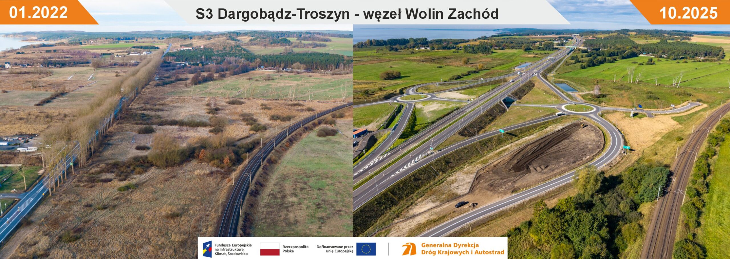 W komunikacie drogowcy pokazali aktualne zdjęcia z odcinka Dargobądz–Troszyn, w tym węzły Wolin Wschód, Wolin Zachód oraz widok w kierunku Troszyna. Fotografie potwierdzają, że inwestycja jest już na finiszu, a ostatnie prace wykończeniowe trwają głównie przy oznakowaniu i infrastrukturze towarzyszącej.