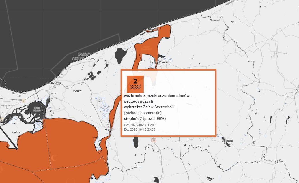 Instytut Meteorologii i Gospodarki Wodnej wydał ostrzeżenie hydrologiczne drugiego stopnia dla obszaru Zalewu Szczecińskiego w województwie zachodniopomorskim. Zjawisko obejmuje również teren powiatu kamieńskiego, w tym okolice Kamienia Pomorskiego, Wolina i Dziwnowa.