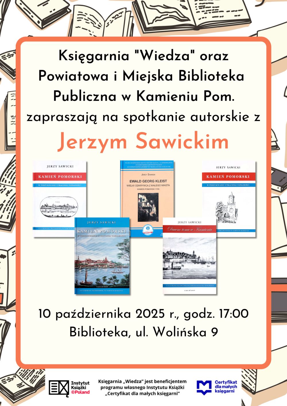 Księgarnia „Wiedza” oraz Powiatowa i Miejska Biblioteka Publiczna w Kamieniu Pomorskim zapraszają 10 października (piątek) o godzinie 17.00 do siedziby Biblioteki na ulicę Wolińską 9, na spotkanie autorskie z Jerzym Sawickim, autorem wielu popularnych opracowań dotyczących historii Kamienia Pomorskiego. Zapraszamy!