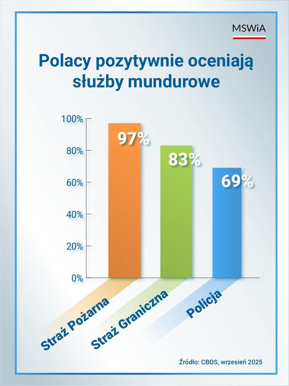 Nowe wyniki badania CBOS pokazują, że Państwowa Straż Pożarna cieszy się niemal powszechnym zaufaniem społecznym — aż 97% ankietowanych wyraziło pozytywną ocenę jej działań. Ta notka pojawiła się niedawno na profilu Komendy Powiatowej Państwowej Straży Pożarnej, która dziękuje obywatelom za okazywane zaufanie.