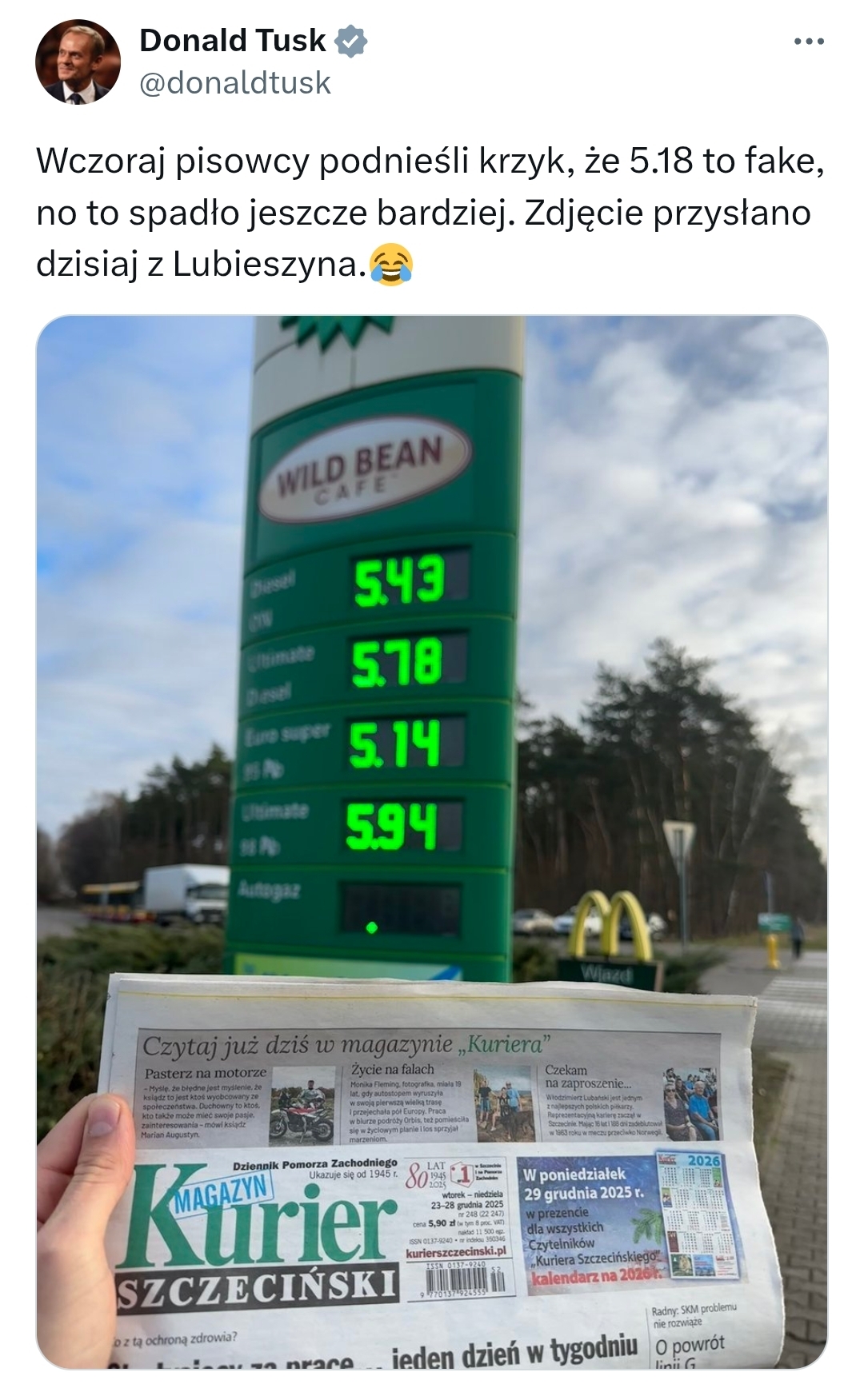 Premier Donald Tusk opublikował na platformie X wpis, w którym poinformował, że cena paliwa spadła już do 5,14 zł za 1 litr. Zdjęcie takiej ceny przesłano z miejscowości Lubieszyn. „Wczoraj pisowcy podnieśli krzyk, że 5.18 to fake, no to spadło jeszcze bardziej” – napisał premier. Jeszcze w poniedziałek Tusk pokazywał zdjęcie ceny 5,18 zł z 21 grudnia w porównaniu z ceną 6,78 zł z 11 października 2022 r.