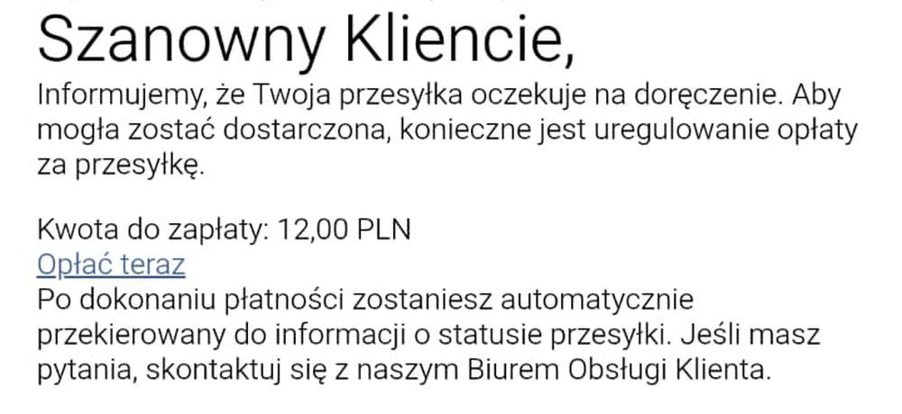 Ofiara otrzymuje wiadomość o niedostarczonej przesyłce. W treści pojawia się niewielka kwota do zapłaty (np. 12 zł, 3,50 zł, 4,99 zł). Po kliknięciu w link następuje przekierowanie na fałszywą stronę logowania lub płatności. Po wprowadzeniu danych karty lub BLIK – przestępcy przejmują środki z konta.