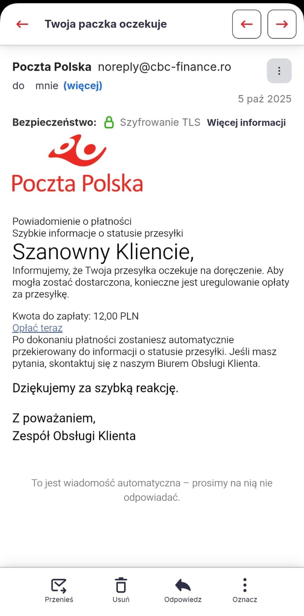 Adres nadawcy takich wiadomości bywa mylący – zamiast pochodzić z domeny „@poczta-polska.pl”, często ukryty jest pod zagranicznym adresem, np. „noreply@cbc-finance.ro”.
