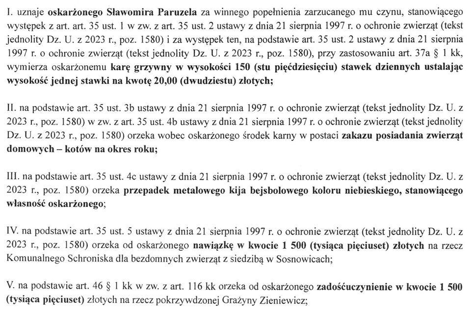 Orzeczenie jest prawomocne i wykonalne. Sprawca ponosi również koszty postępowania sądowego. Sąd jasno dał sygnał: okrucieństwo wobec zwierząt nie pozostaje bez konsekwencji.