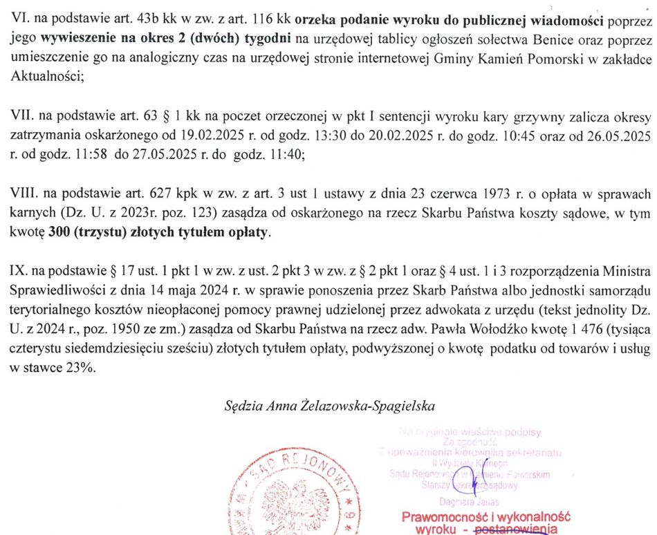 Sąd uznał, że kara finansowa to za mało. Dlatego orzekł podanie wyroku do publicznej wiadomości: na tablicy ogłoszeń sołectwa Benice, oraz na oficjalnej stronie internetowej Gminy Kamień Pomorski. Przez dwa tygodnie każdy będzie mógł przeczytać, kto i za co został skazany.