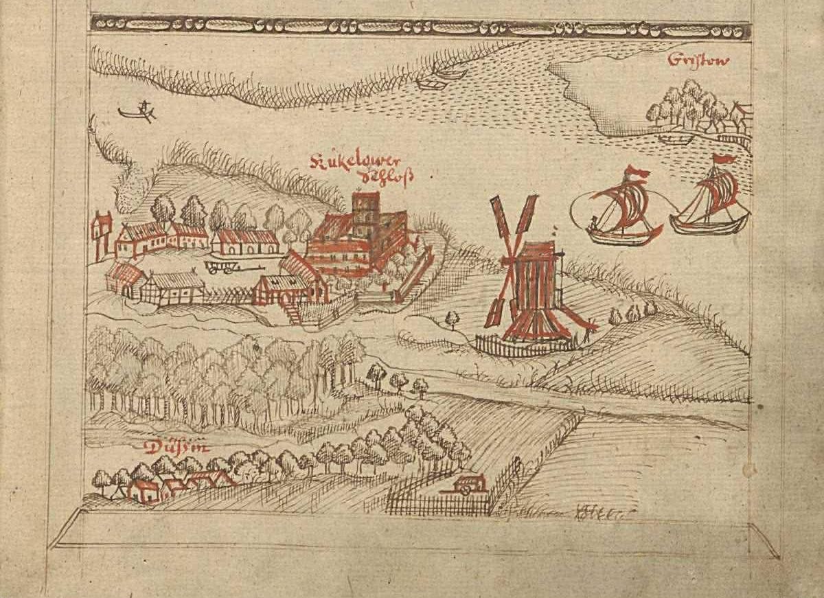 To właśnie ten słabo czytelny łuk, widoczny najlepiej z lotu ptaka, wskazuje miejsce, gdzie przez wieki istniało założenie zamkowe. Centralna część terenu, gdzie według źródeł archiwalnych stał zamek kapituły kamieńskiej, nie wyróżnia się już żadną dominantą architektoniczną. W zestawieniu z XVII-wieczną ryciną z protokołu kapitulnego kontrast ten jest uderzający – tam, gdzie niegdyś widniał „Kucklower Schloss” z zabudowaniami, fosą i wiatrakiem, dziś rozciąga się zwyczajna przestrzeń gospodarcza.