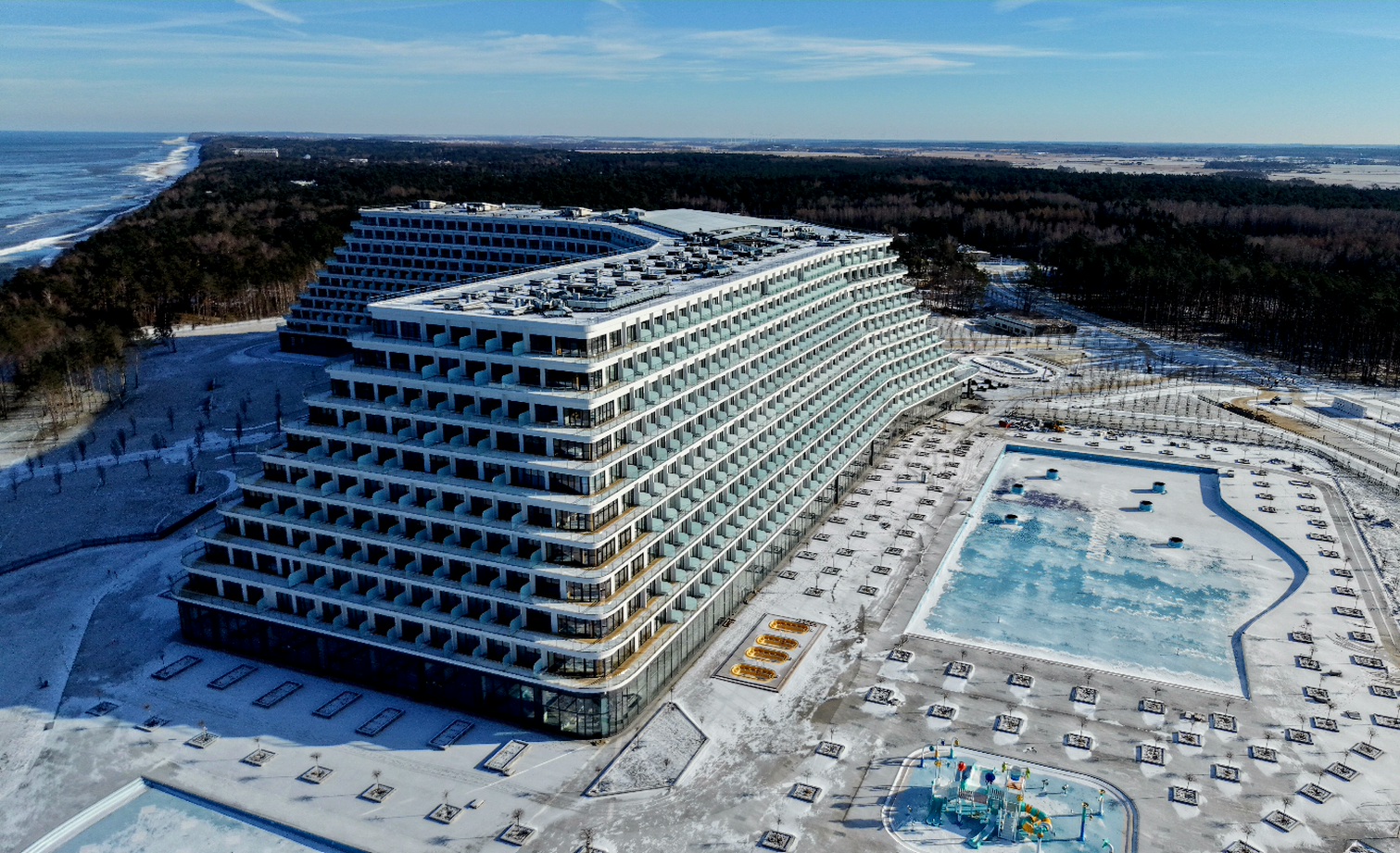 Bałtyk tej zimy pokazuje zupełnie inne oblicze. Morze skute lodem, śnieg przykrywający plaże i drogi dojazdowe, cisza przerywana jedynie wiatrem znad wody. W takim krajobrazie szczególnie wyraźnie odcina się ogromna bryła nowego hotelu, który już wkrótce ma stać się jednym z najbardziej rozpoznawalnych obiektów turystycznych w Polsce.