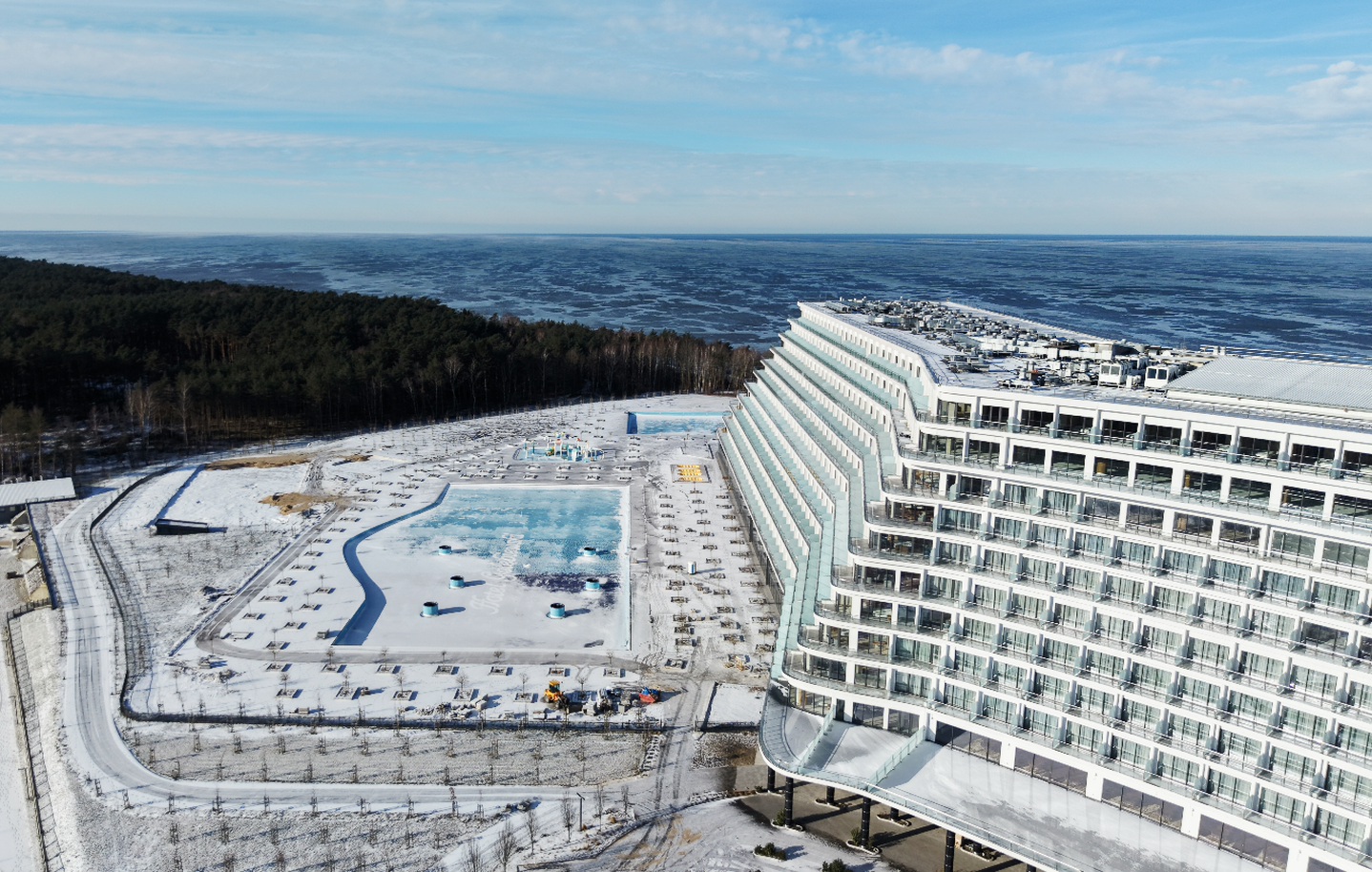 Zimą wszystko wygląda inaczej. Skala inwestycji, która latem ginęłaby wśród turystów, ruchu i dźwięków, teraz wybrzmiewa w pełni. Monumentalny obiekt stoi niemal samotnie pomiędzy lasem a zamarzniętym morzem, otoczony bielą i spokojem. To moment przejściowy – pomiędzy budową a życiem, pomiędzy ciszą a przyszłym ruchem setek, a docelowo tysięcy gości.
