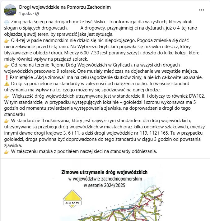 „Zimą pada śnieg i na drogach może być ślisko – to informacja dla wszystkich, którzy ukuli slogan o śpiących drogowcach. A drogowcy, przynajmniej ci na dyżurach, już o 4-tej rano objeżdżają swój teren, by sprawdzić jaka jest sytuacja. O 4-tej w pasie nadmorskim nie działo się nic niepokojącego. Pogoda zmieniła się dość nieoczekiwanie przed 6-tą rano. Na Wybrzeżu Gryfickim pojawiła się mżawka i deszcz, który błyskawicznie oblodził drogi. Między 6.00-7.30 jest poranny szczyt i doszło do kilku kolizji, które miały również wpływ na przejazd solarek” – czytamy.