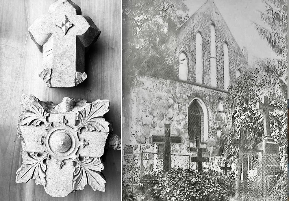 Zwieńczenie składa się z dwóch elementów: górnej części o formie stylizowanego krzyża z geometrycznym ornamentem gwiaździstym, dolnego fragmentu z dekoracją roślinną oraz centralnym medalionem, ujętym w motyw czteroliścia i liści akantu. Kompozycja wyraźnie nawiązuje do neogotyku, popularnego w architekturze sakralnej Pomorza w XIX i na początku XX wieku. Element ten pierwotnie znajdował się nad portalem wejściowym świątyni, podkreślając jej sakralny charakter oraz reprezentacyjność fasady. Stan zachowania wskazuje na uszkodzenia mechaniczne, które najpewniej powstały podczas destrukcji kościoła lub późniejszych prac rozbiórkowych.
